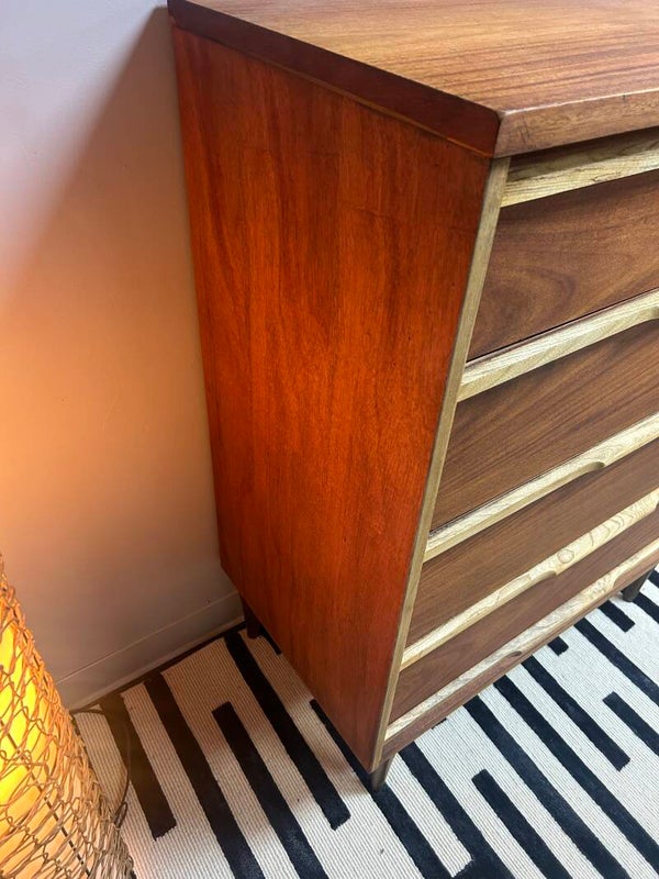 midcentury 4 drawer walnut tall dresser with oak drawer pulls