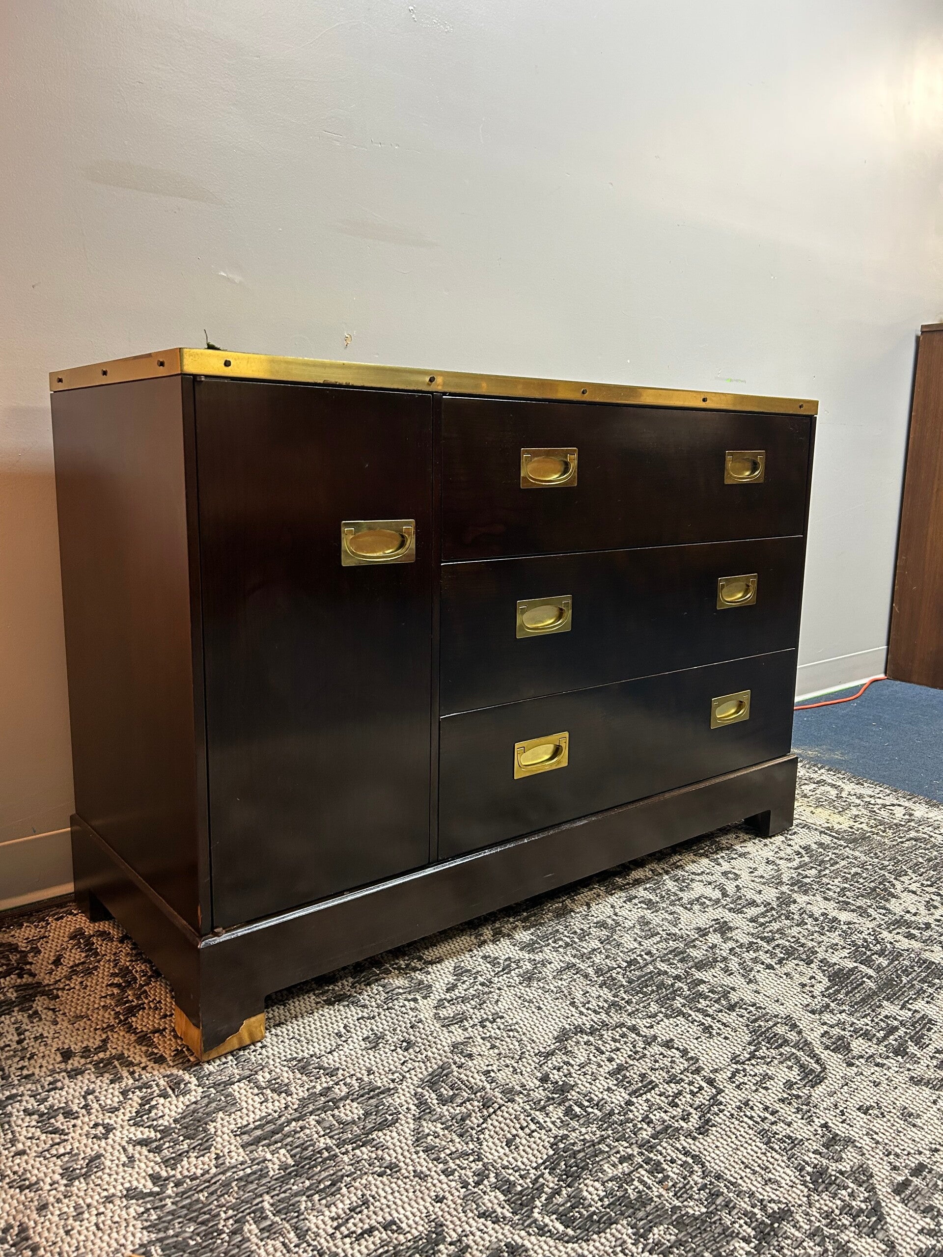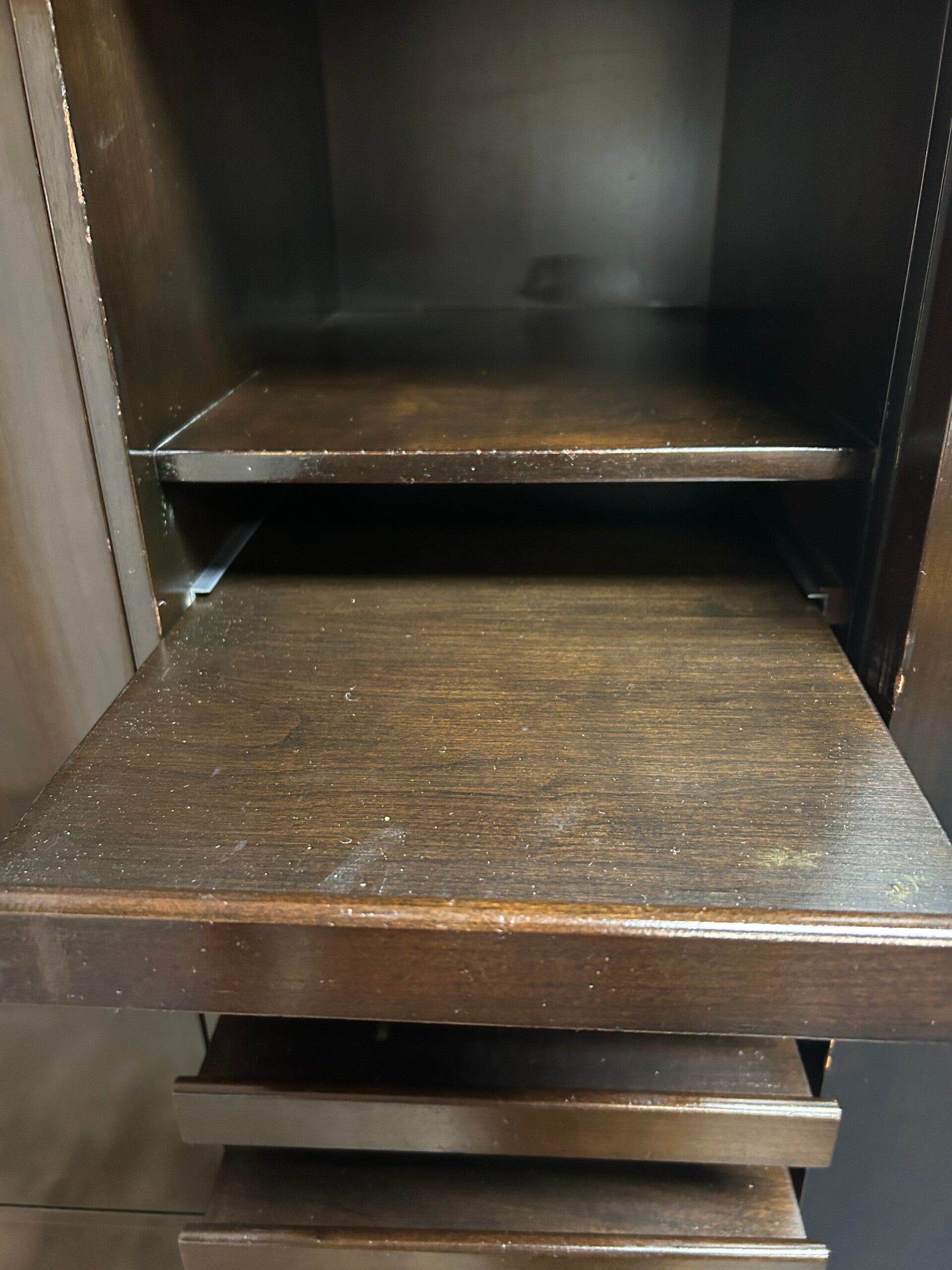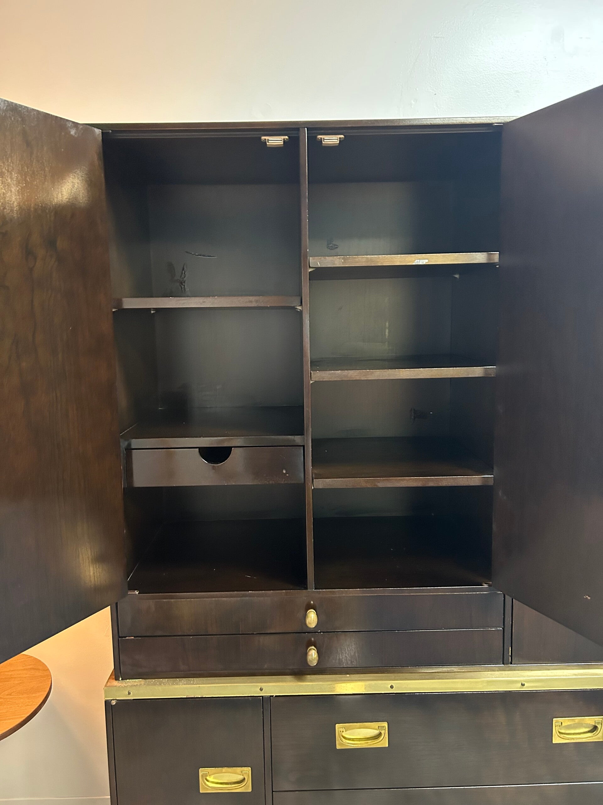 this is a beautiful 2 piece armire with brass pulls. there is a ton of space in this badboy. there is a perfect space for dress shirts or ties. the bottom of this armoire could be a beautiful credenza.