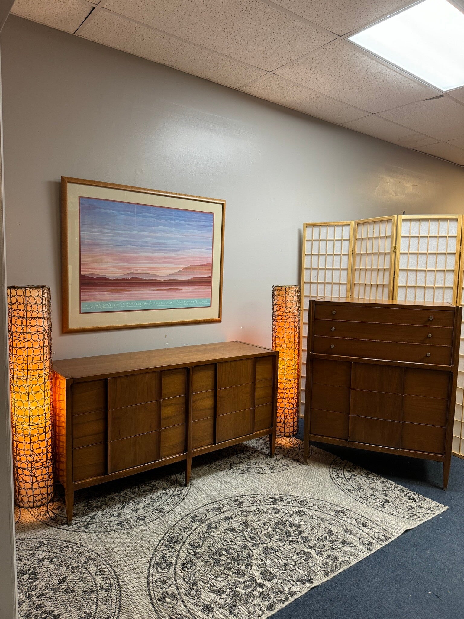 Sleek dresser set by American of Martinsville! Beautiful original condition with capped feet and original walnut hardware, and sculpted bentwood design. Dovetail drawer joinery and solid wood casing, with beautiful walnut wood grain.