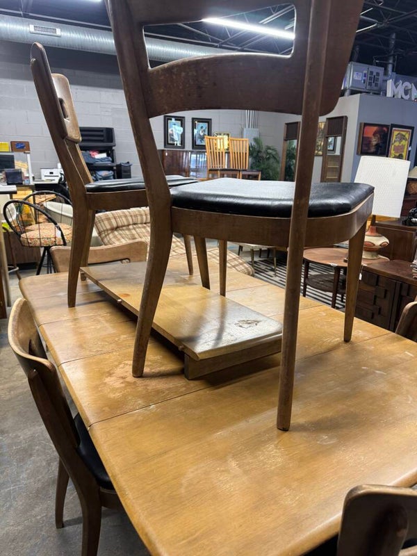 This is a Heywood-Wakefield dining set that is original and made of birch. The set includes a table and chairs, and it has a classic American style.