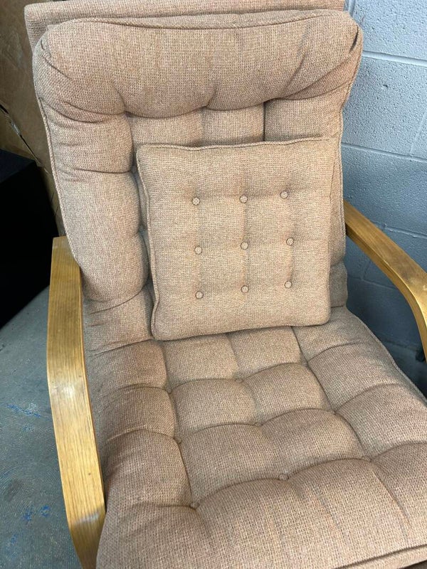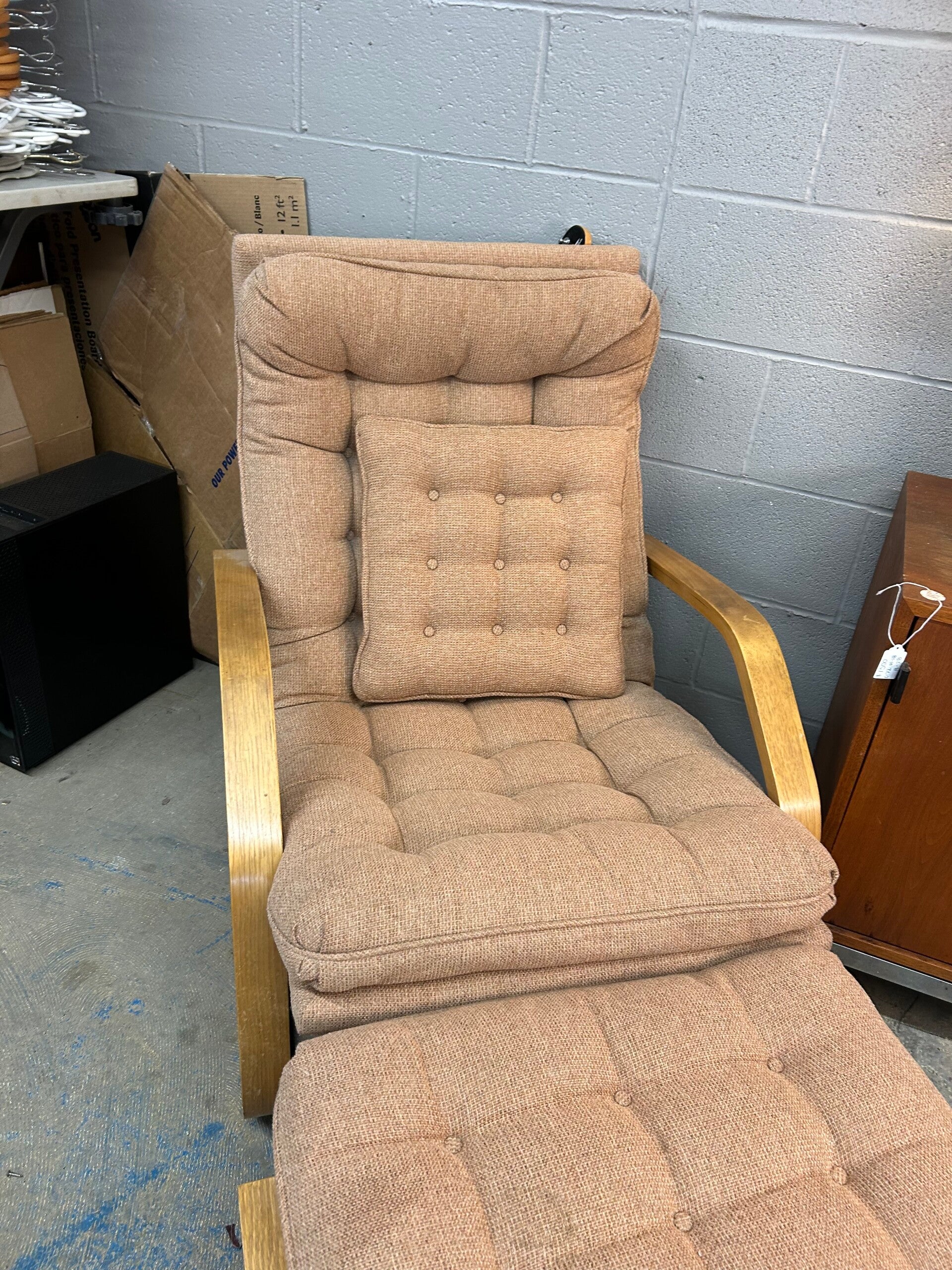 Kick back in comfort and style with this vintage mid-century modern lounge chair and ottoman set. Featuring a sleek Scandinavian-inspired frame crafted from molded oak, the chair offers smooth curves and solid support. The tufted, earth-tone cushions are thick and plush, creating a cozy, laid-back feel perfect for reading, relaxing, or catching up on your favorite show. The matching ottoman adds extra comfort, making this set a must-have for any modern or retro-inspired space. Only one chair available.