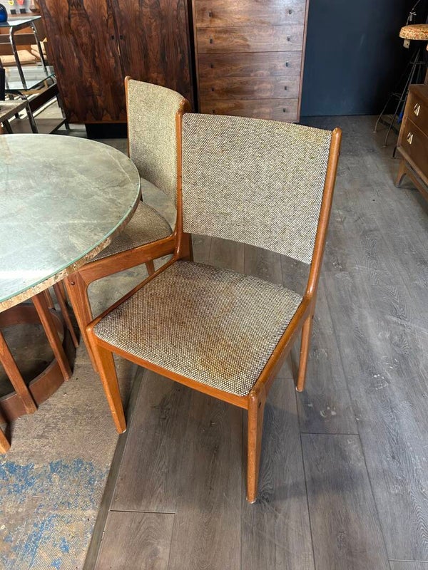 Bring refined retro charm to your dining space with this stunning mid-century modern dining set. The round table features a solid marble top in soft green tones, perfectly paired with a sculptural walnut base that adds warmth and architectural appeal. Surrounding the table are four beautifully crafted teak dining chairs, upholstered in a textured neutral fabric that complements the natural wood grain. With its timeless design and quality materials, this set is ideal for both everyday meals and stylish entertaining.