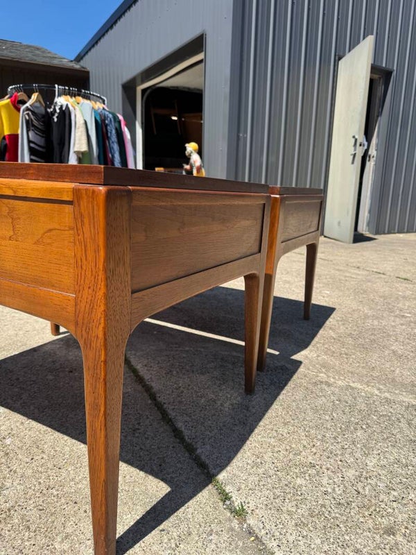 This beautifully matched pair of Lane Rhythm end tables brings classic mid-century elegance to any space. Crafted from rich walnut with clean lines and subtly tapered legs, each table features a single drawer with sculpted wood pulls and smooth sliding function. The craftsmanship and proportion make them versatile enough for use as nightstands or side tables, offering both form and function in a warm, vintage package. A perfect pair to complete your MCM living room or bedroom setup.