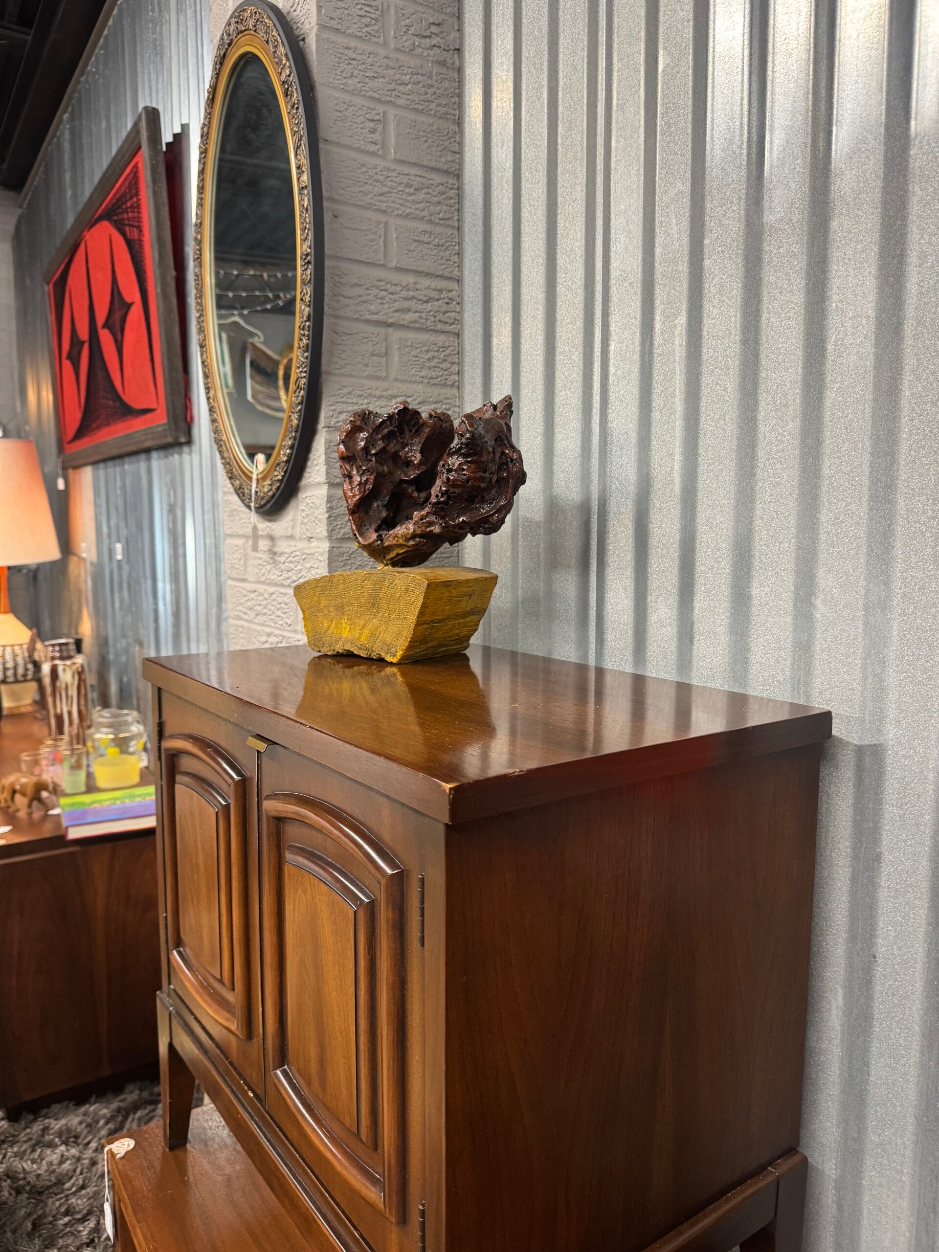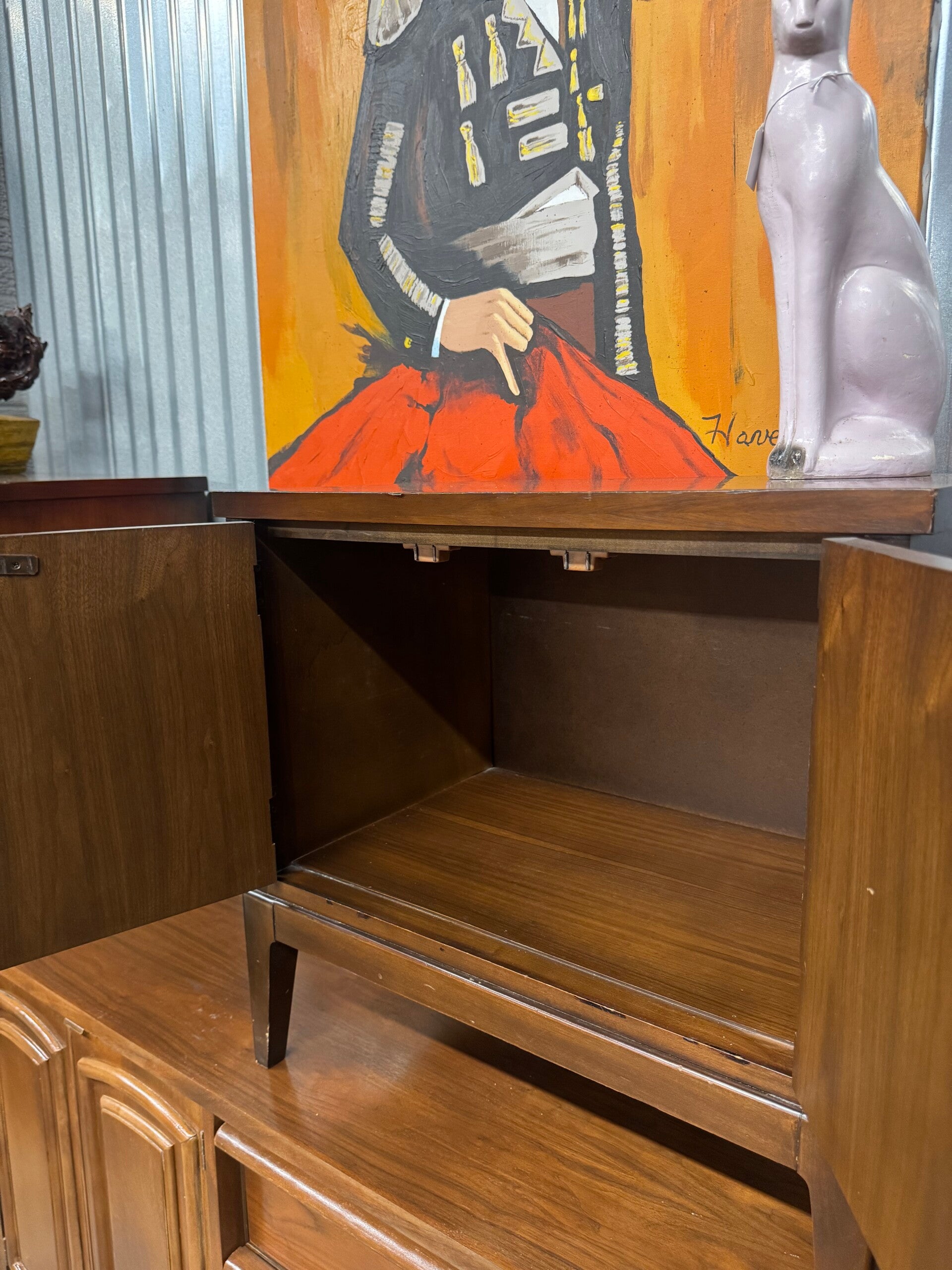 Bring timeless charm to your bedroom or living space with this matching pair of vintage Lane Rhythm nightstands. Crafted from rich walnut with beautiful wood grain and signature sculpted lines, these pieces are a perfect representation of mid-century modern design. They feature double paneled cabinet doors and raised base with clean lines and classic craftsmanship.
