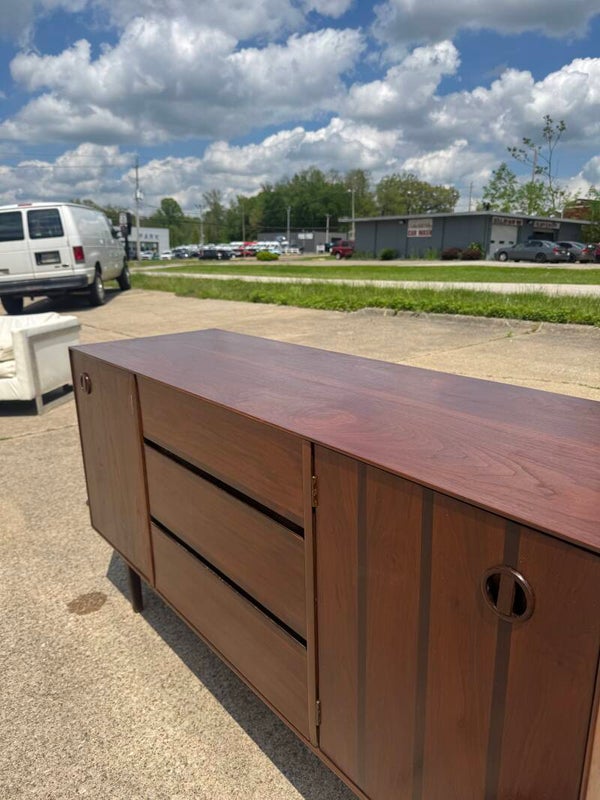Add timeless elegance and smart storage to your space with this vintage mid-century modern credenza by Stanley Furniture. Featuring rich walnut tones, sculpted vertical wood accents, and sleek minimalist lines, this piece is a true statement of 1960s design. This versatile piece works beautifully as a credenza, media console, buffet, or dresser, making it a must-have for any MCM collector or design enthusiast.
