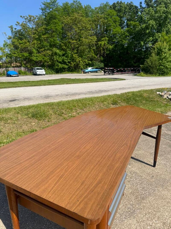 This stunning Mid-Century Modern desk by Stow Davis is a sleek and functional statement piece, showcasing the brand’s signature craftsmanship and design ethos from the 1960s. Featuring rich walnut wood, three deep drawers with distinctive brushed aluminum pulls, and tapered legs with brass-capped feet, this desk combines elegance with utility. The floating drawer design adds a touch of architectural flair, while the generous workspace makes it ideal for both home offices and creative studios. A rare and collectible piece, it brings timeless sophistication to any modern or vintage-inspired interior.