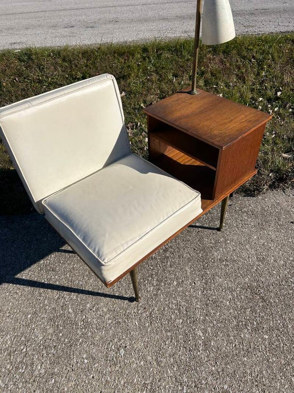 A charming and unique mid-century “gossip bench,” originally designed for the home telephone — now a perfect modern accent seat with built-in function. This piece features a sleek vinyl seat, attached side table with open storage, and an original fiberglass-shade lamp for a warm retro glow. Integrated table with dual storage cubbies. Chair has a creamy vinyl upholstery for an easy-to-clean finish. Lamp is in working condition.