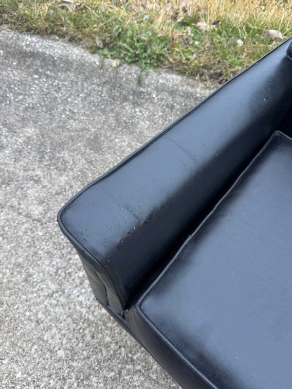 A classic mid-century modern long sofa featuring a clean-lined silhouette, button-tufted back, and brass-capped tapered legs for the perfect touch of vintage sophistication. Upholstered in durable black vinyl, this piece delivers style, comfort, and easy maintenance. Good vintage condition with some expected signs of wear to cushions and frame. Structurally solid and comfortable — ready to use or reupholster for a custom designer look.