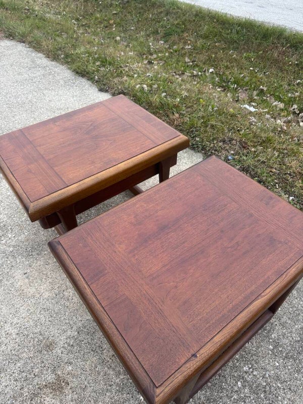 A beautifully crafted pair of mid-century modern end tables by Lane Furniture. Featuring a warm walnut finish and a distinctive sculpted base design, these tables bring both utility and timeless style to any living space. Excellent structural condition with light, age-appropriate wear. Surfaces are clean and ready to enjoy. Pairs like this are increasingly hard to source — especially from sought-after makers like Lane. A versatile and collectible duo that instantly enhances any mid-century or modern interior.