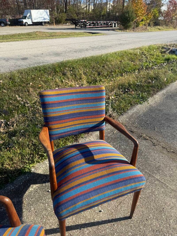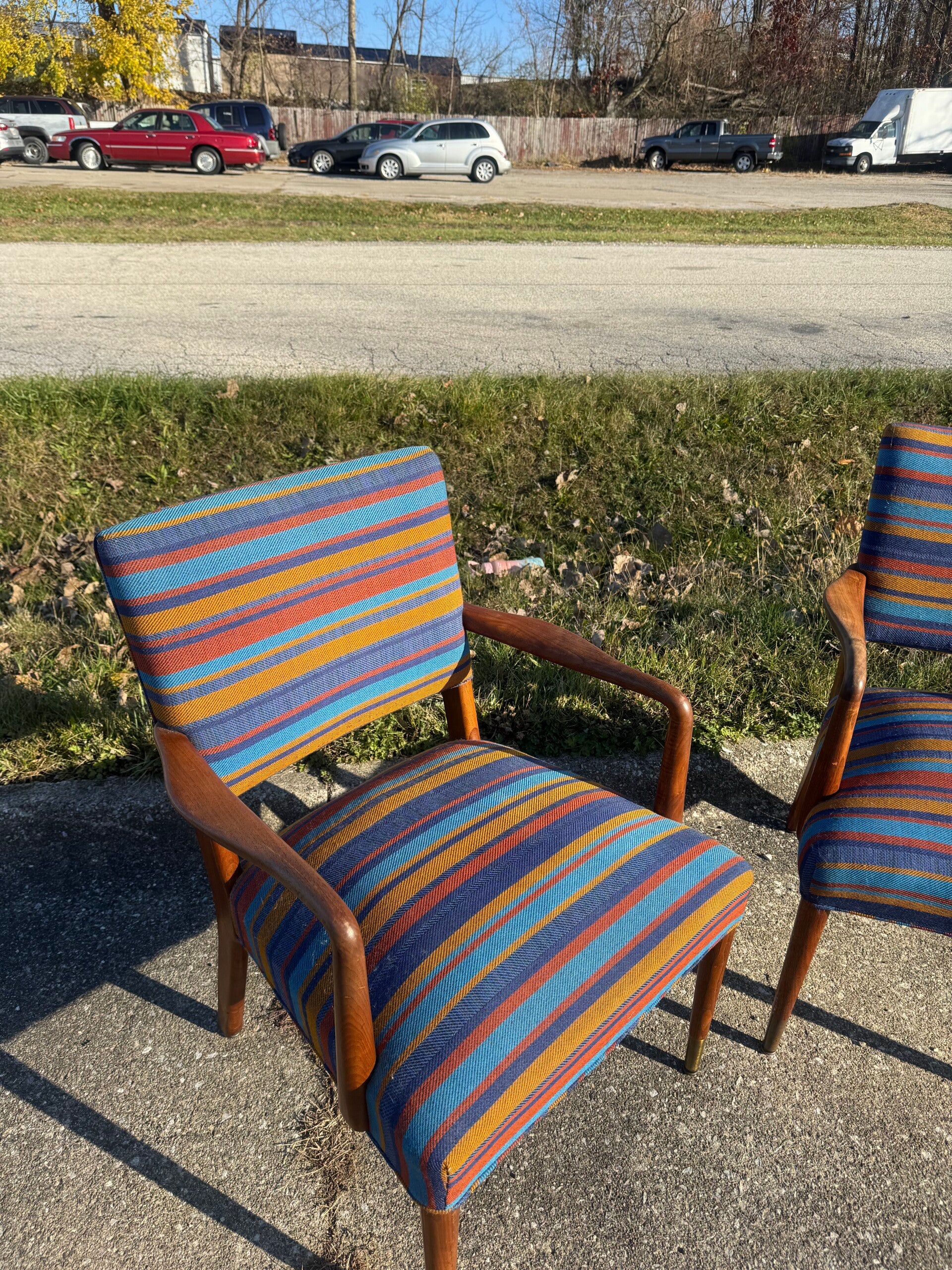 A fun and stylish pair of mid-century modern accent chairs featuring vibrant striped upholstery and beautifully sculpted wooden frames. These chairs bring personality, comfort, and classic MCM charm to any room. Structurally sturdy and comfortable. Upholstery shows light wear consistent with age — usable as-is or an excellent reupholstery candidate for a custom designer look. These chairs are a great way to add a pop of color and mid-century flair to your home. Versatile enough to style separately or together for a cohesive aesthetic.
