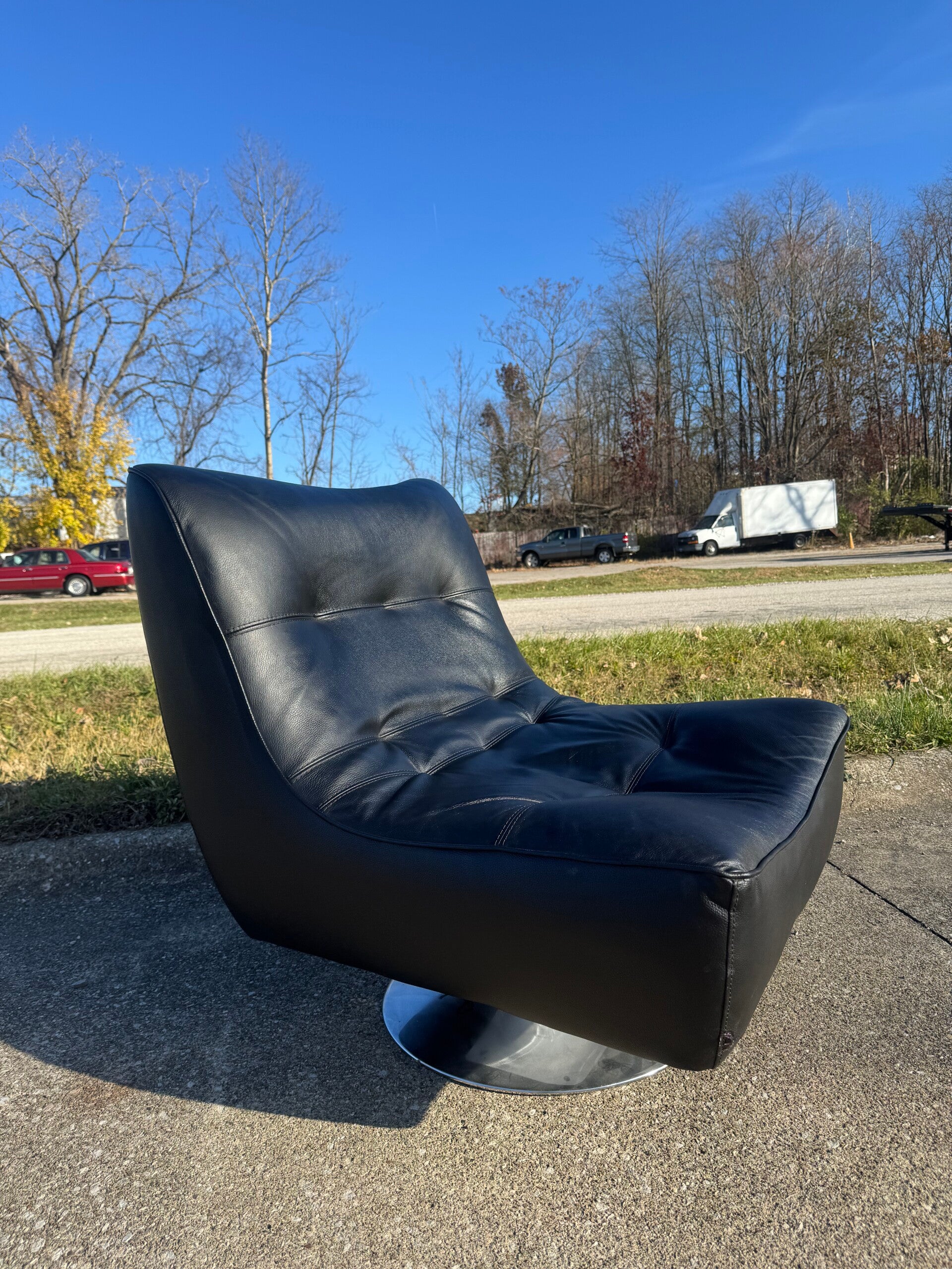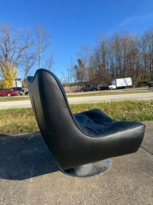 A stylish and comfortable mid-century modern lounge chair featuring a flowing sculptural form and sturdy chrome swivel base. Upholstered in smooth black vinyl, this piece offers bold retro personality with everyday functionality. Overall solid condition with minor wear on upholstery from age. Swivel mechanism works smoothly. Ready to enjoy as-is or reupholster for a custom designer look. A standout statement chair for living rooms, studios, offices, or lounge spaces — perfect for fans of mid-century and space-age design.