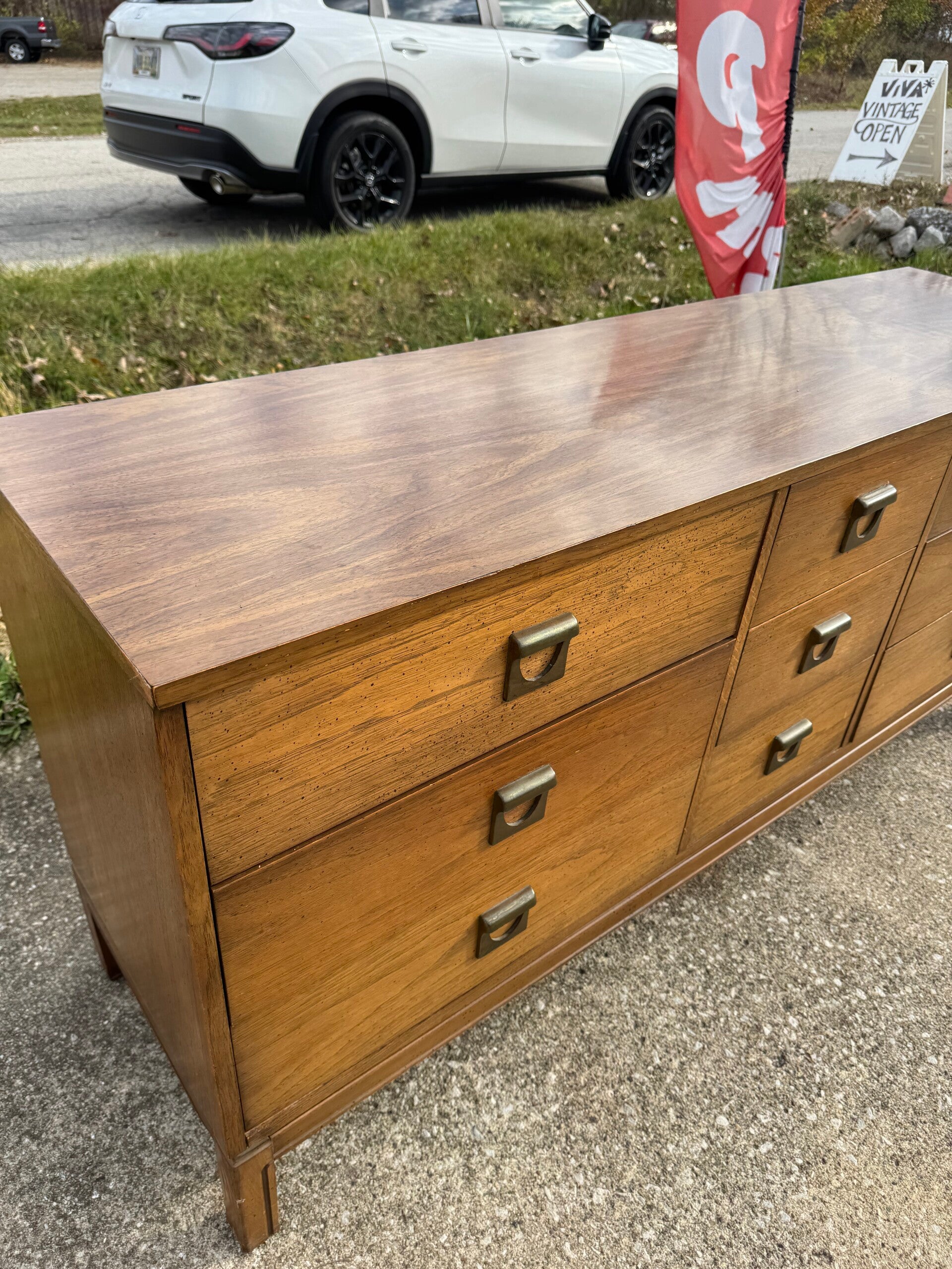 This striking Dixie mid-century modern 9-drawer dresser features a balanced, architectural silhouette with warm wood tones and classic brass hardware. The well-proportioned drawer layout provides ample storage while maintaining a clean, streamlined look that is characteristic of Dixie’s mid-century designs.