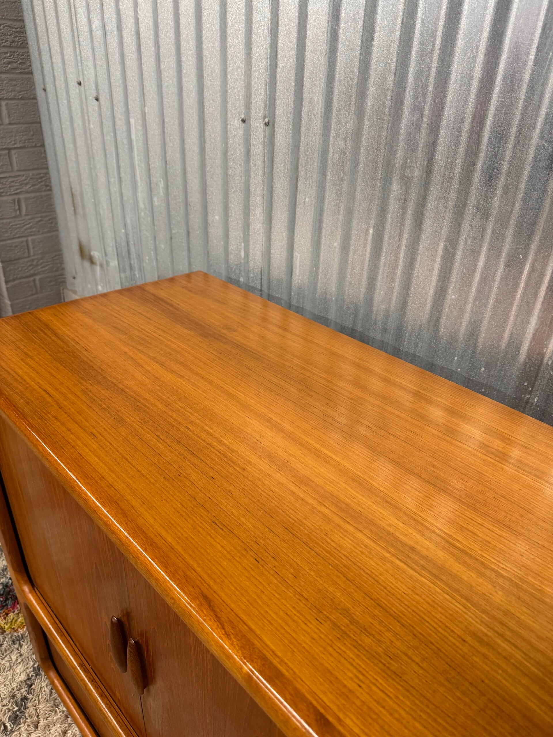 Crafted from solid teak wood and veneer, this highly functional piece features beautifully sculpted, integrated handles and a unique "framed design" with rounded edges. The highlight is its exquisite pair of tambour doors, made of thin bands of teak assembled so finely they appear as a single sheet of wood. These doors glide smoothly into the side compartments, saving space and maintaining a clean, minimalist look.
