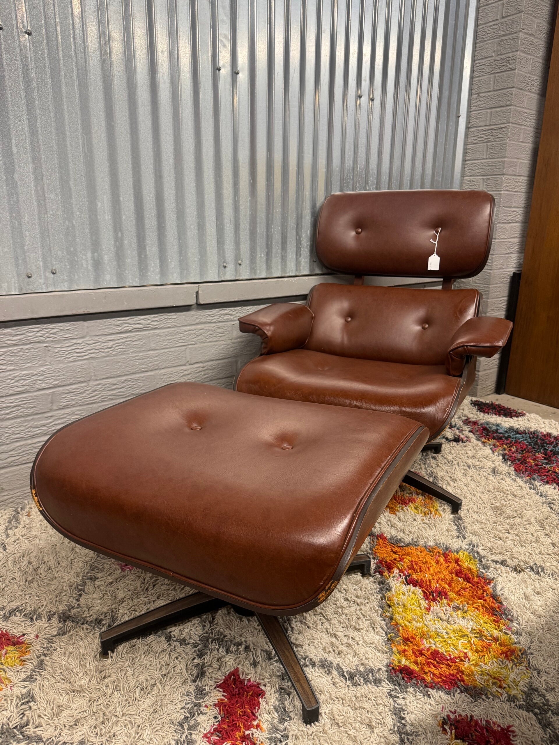 Sink into iconic mid-century style with this vintage Plycraft lounge chair and matching ottoman. Inspired by the timeless Eames design, this set pairs sculptural molded plywood lines with buttery brown leather for the perfect blend of comfort and sophistication.