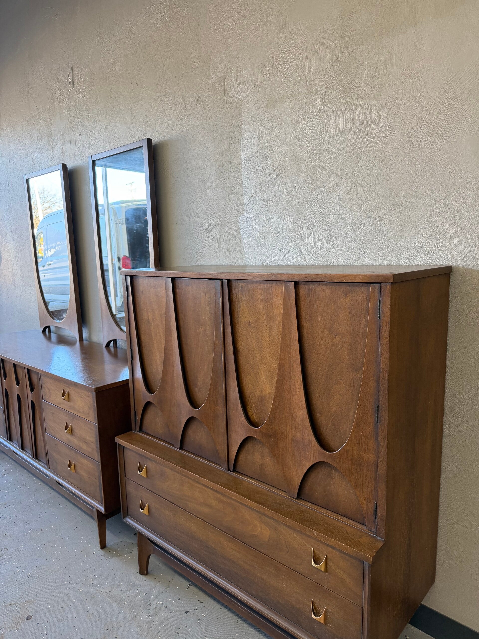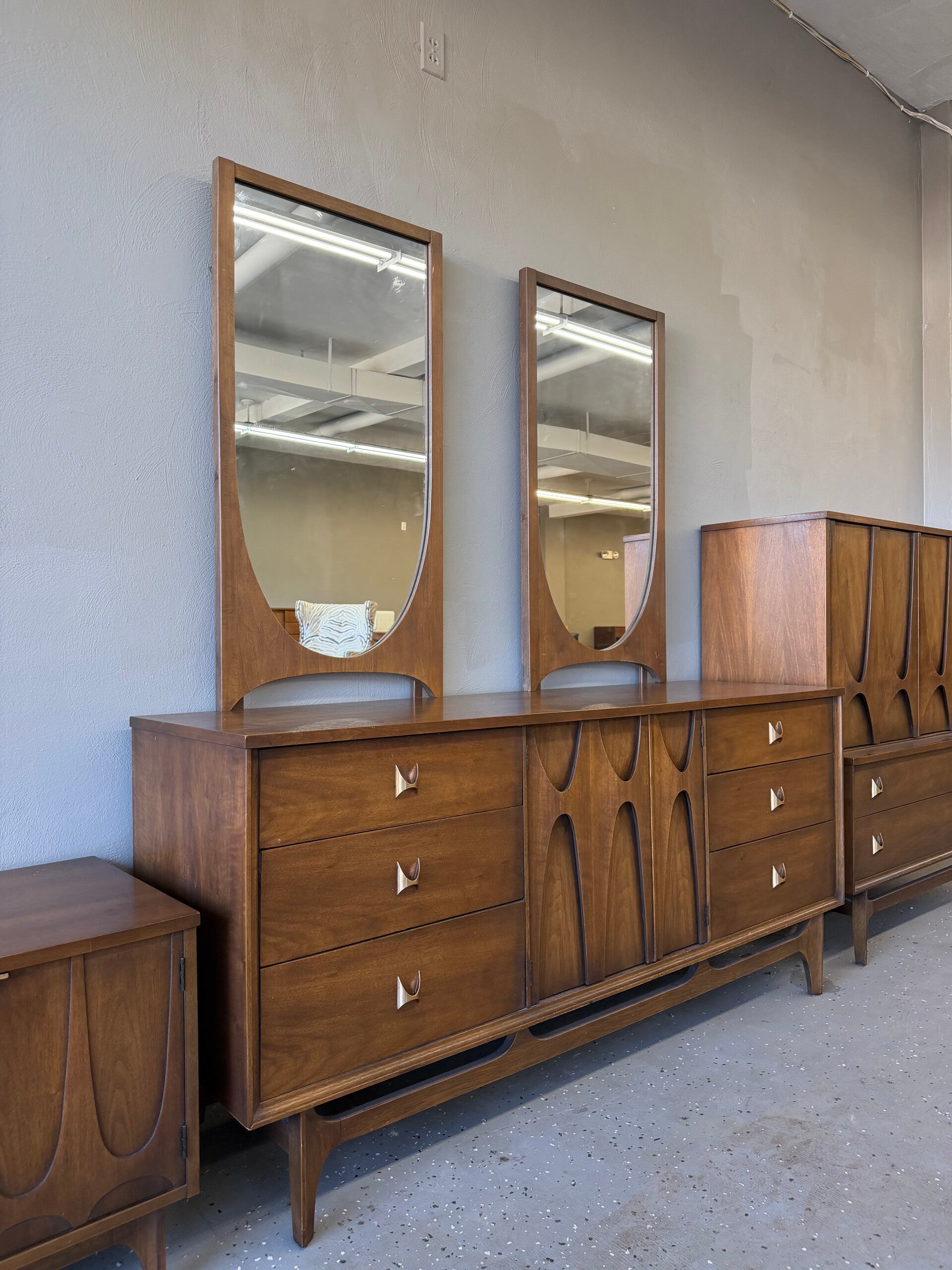 This iconic 6-piece Broyhill Brasilia bedroom set is a premier example of Mid-Century Modern design, famously inspired by the architectural curves of Brazil’s capital city. Crafted from rich American walnut, this comprehensive suite features the signature parabolic "swoops" and elegant brass hardware that define the 1962 collection. The set includes a nine-drawer lowboy dresser with two sculpted mirrors, a tall gentleman’s chest with dramatic bentwood accents, and a pair of matching two-tier nightstands. Combining high-end craftsmanship with a timeless, architectural aesthetic, this sought-after ensemble offers a rare opportunity to own a complete, cohesive piece of design history.