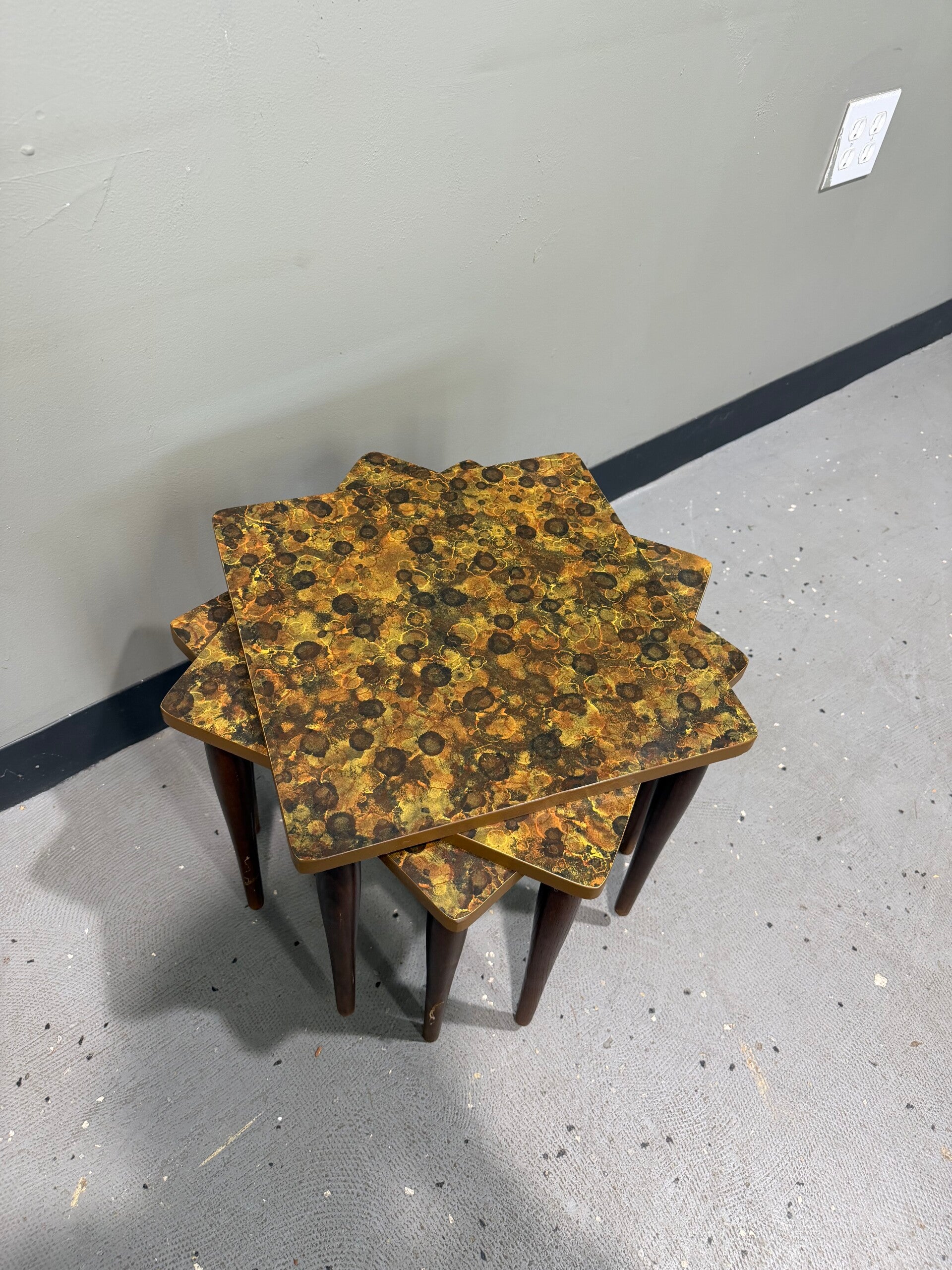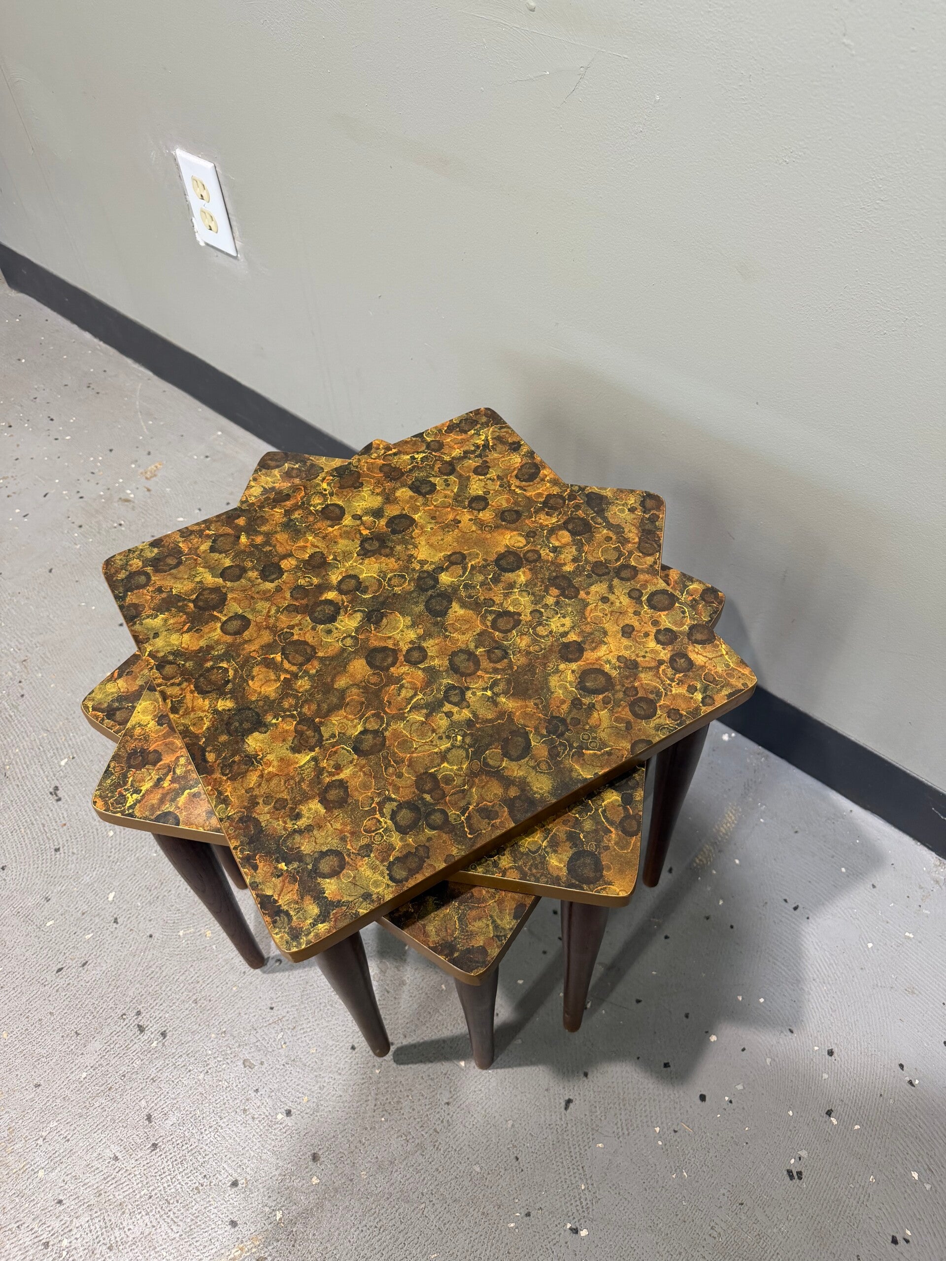 This vintage 3-piece Mid-Century Modern stacking end table set is a quintessential example of 1970s "Space Age" and Boho-Retro functional decor. Crafted with a space-saving design in mind, these tables feature square tops adorned with a vibrant, bubble-art laminate pattern in warm tones of gold, chestnut, and copper. Each table is supported by four sleek, tapered wooden peg legs.