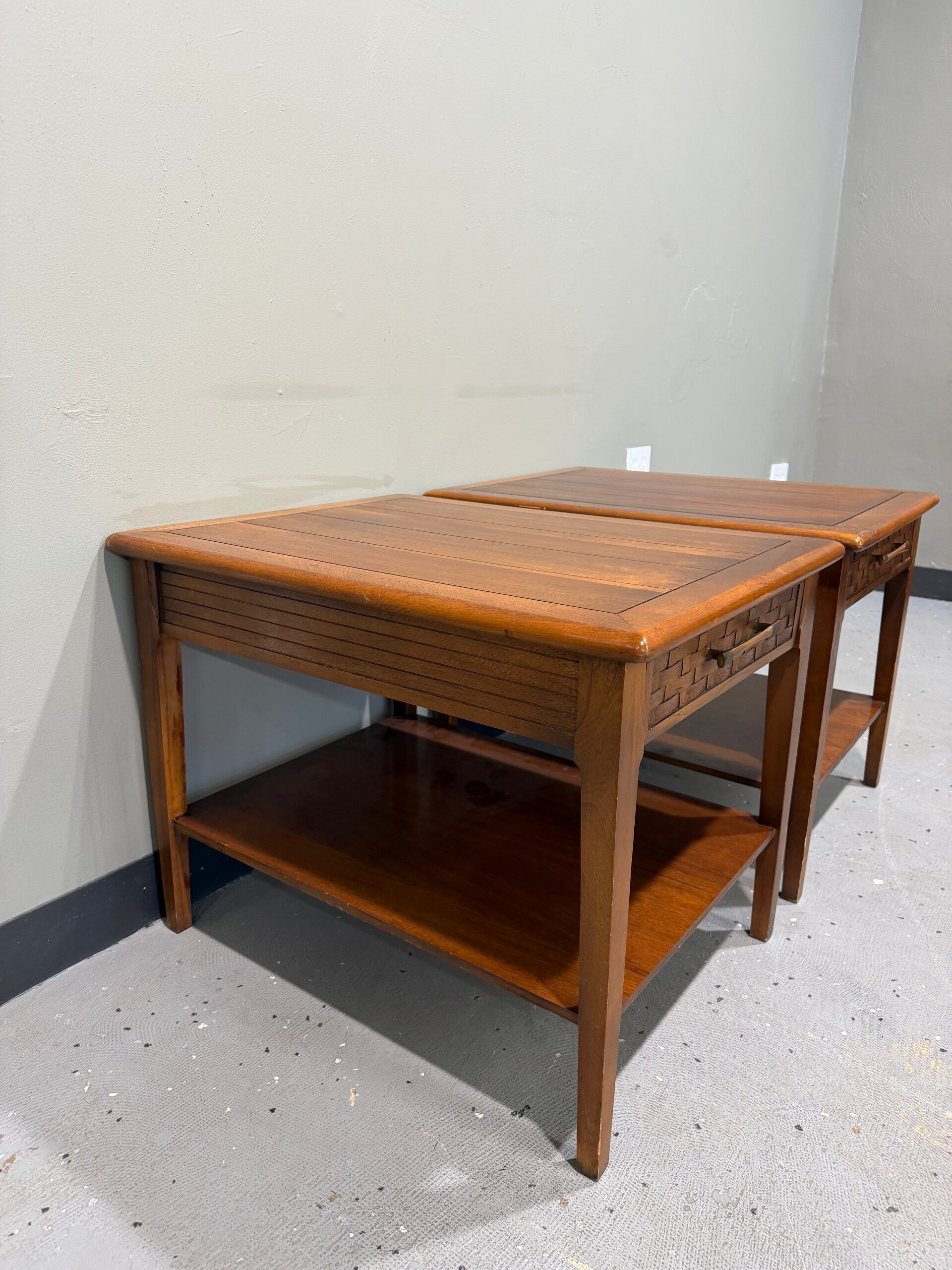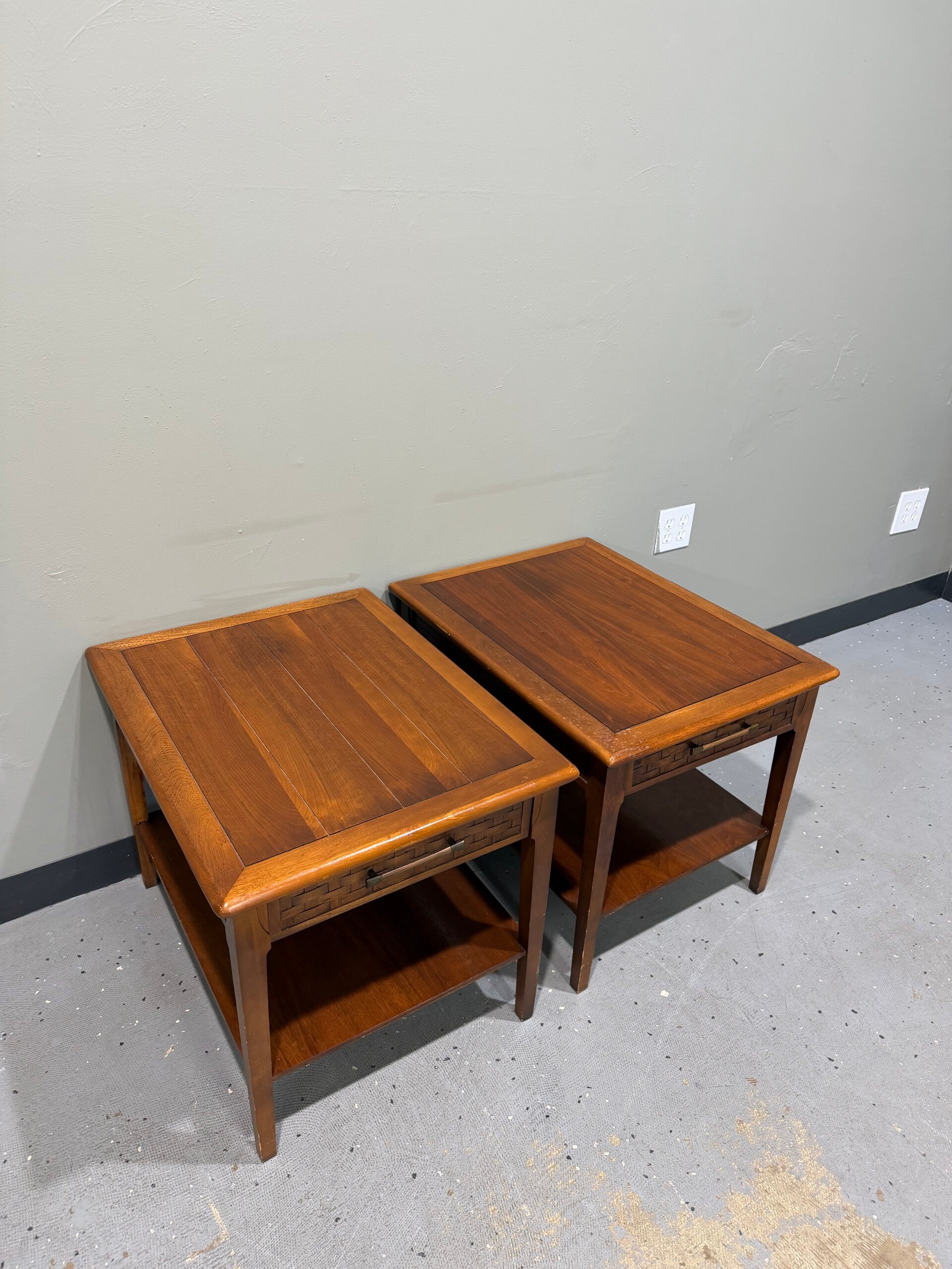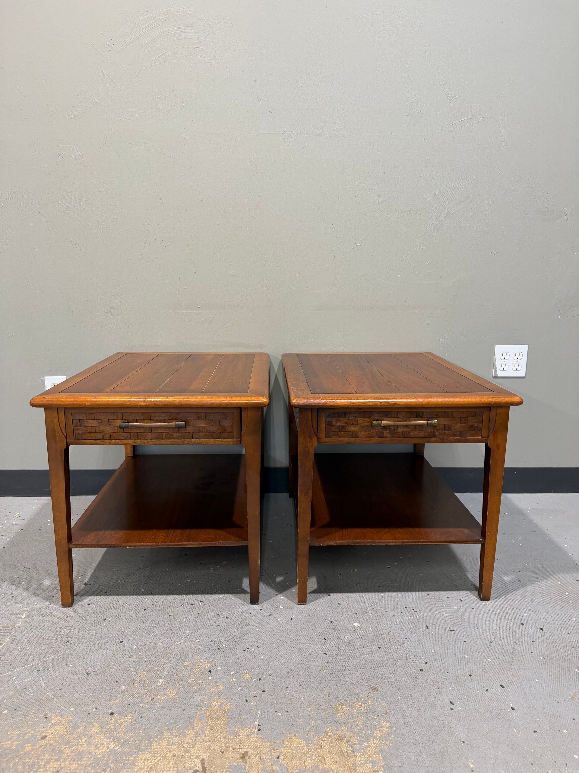 This pair of Mid-Century Modern end tables features a great mix of textures with their warm walnut finish and woven-style drawer fronts. The design is super practical, offering both a hidden drawer for smaller items and a large open shelf below for books or extra storage. With their clean, tapered legs and subtle metal hardware, they have that classic 1960s look that works perfectly next to a sofa or as matching nightstands.
