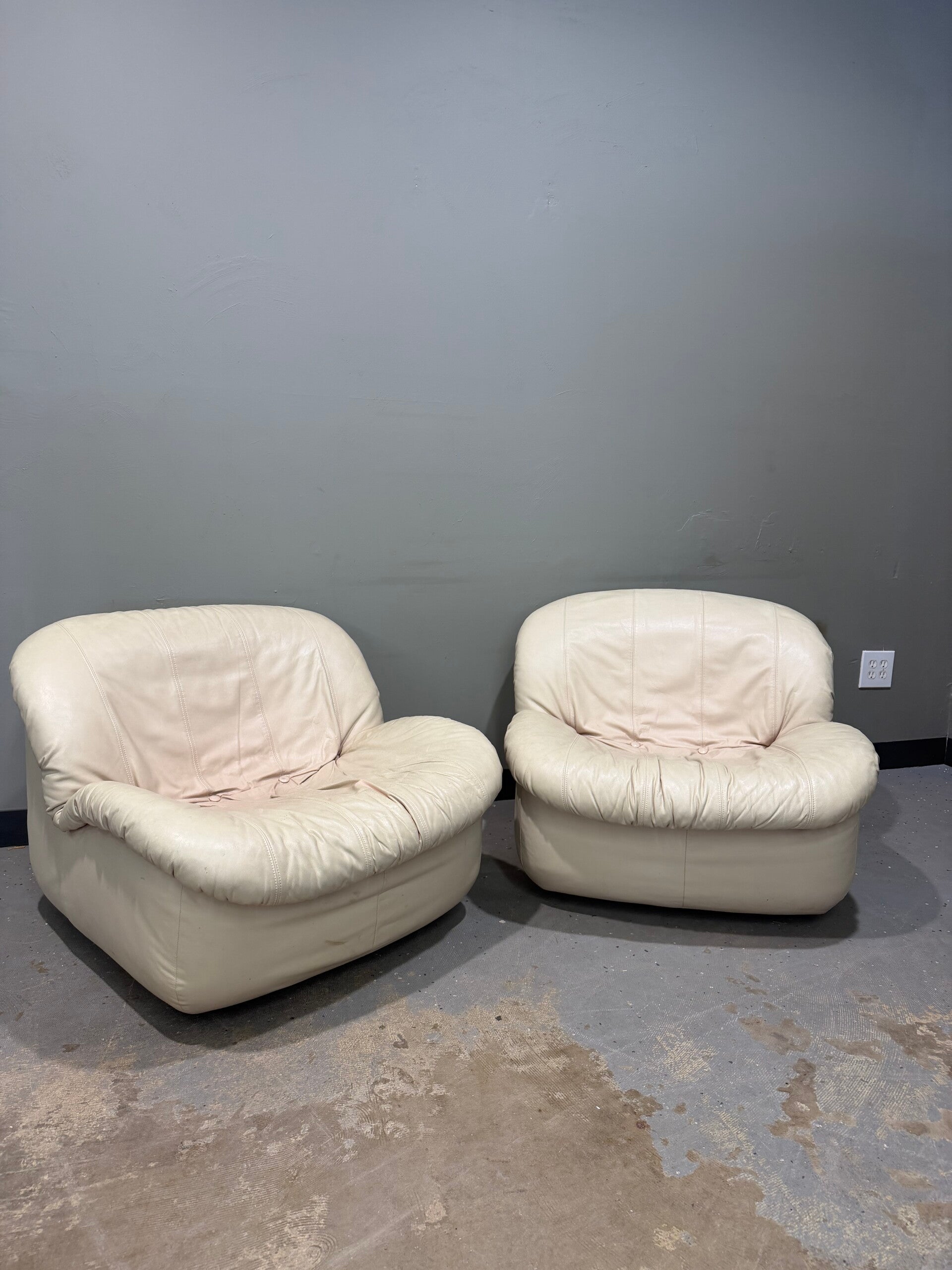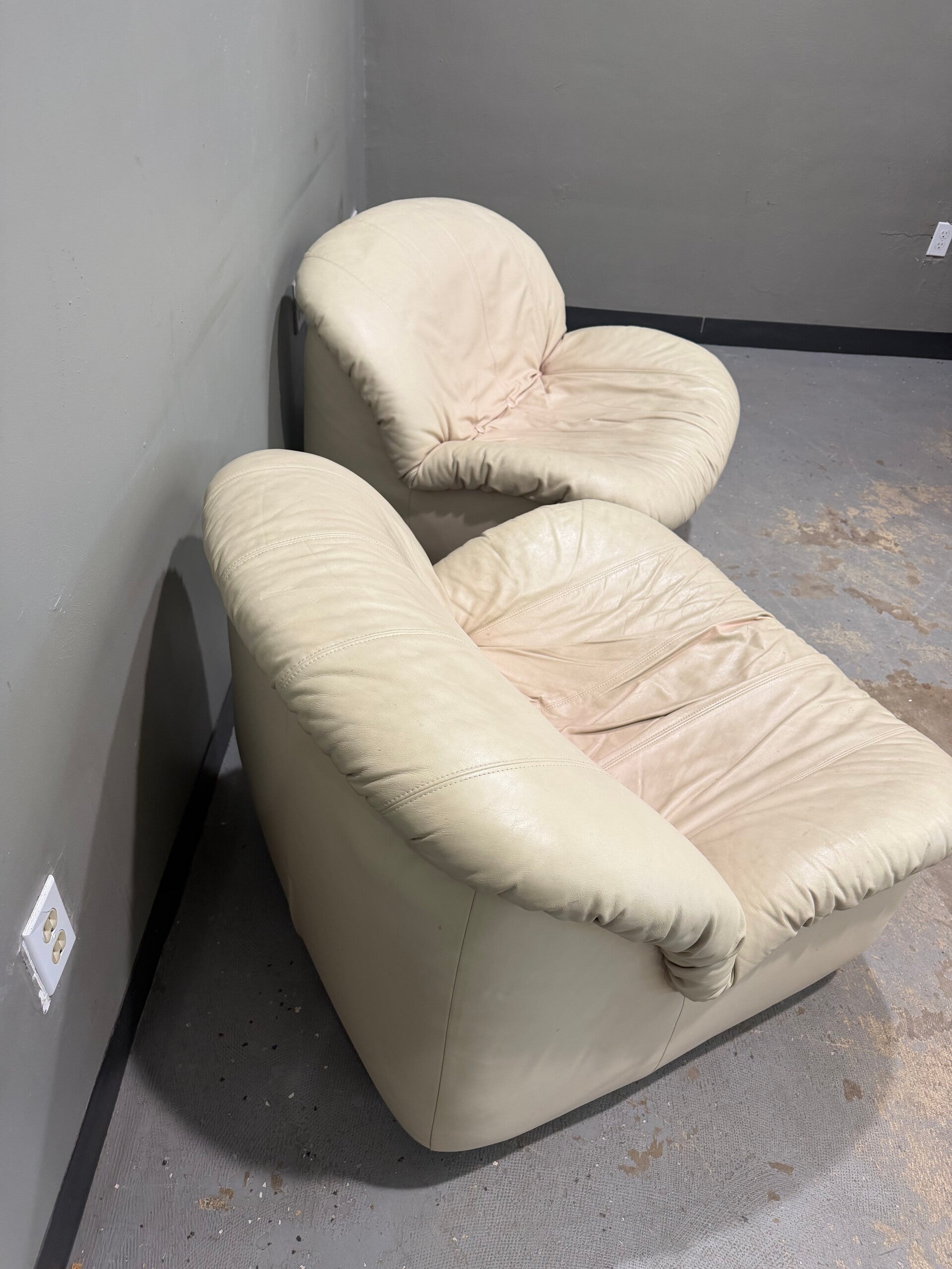 Elevate your interior with this striking pair of vintage 1980s postmodern "Clam Shell" swivel lounge chairs, a sculptural masterclass in late 20th-century design. Featuring a dramatic, low-profile silhouette with a distinctive "peaked" backrest and deep, sink-in comfort, these chairs are upholstered in premium cream-colored leather with classic vertical channel stitching. Each chair is mounted on a hidden, heavy-duty 360-degree swivel base, offering effortless rotation and a smooth gliding motion that blends avant-garde "Space Age" aesthetics with high-end luxury. Whether styled as a sophisticated conversational pair or joined to create a unique modular lounge, these iconic oversized pieces serve as a bold, functional centerpiece for any modern home or high-design office.