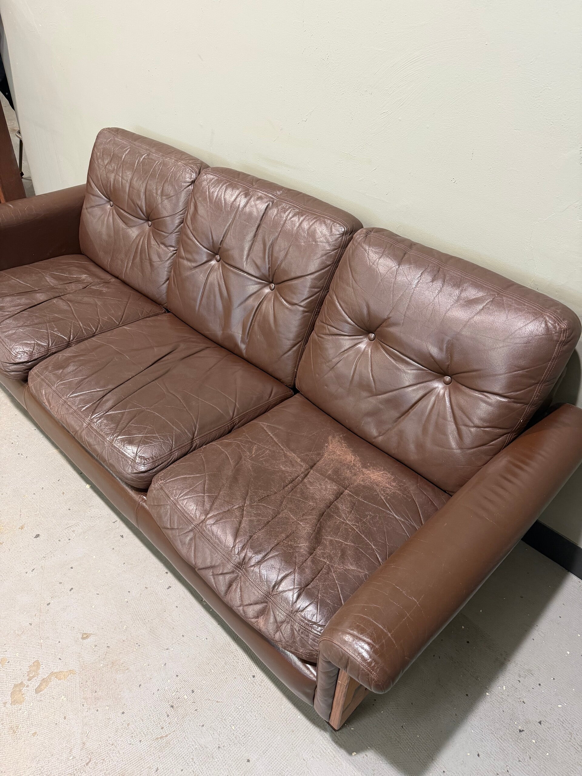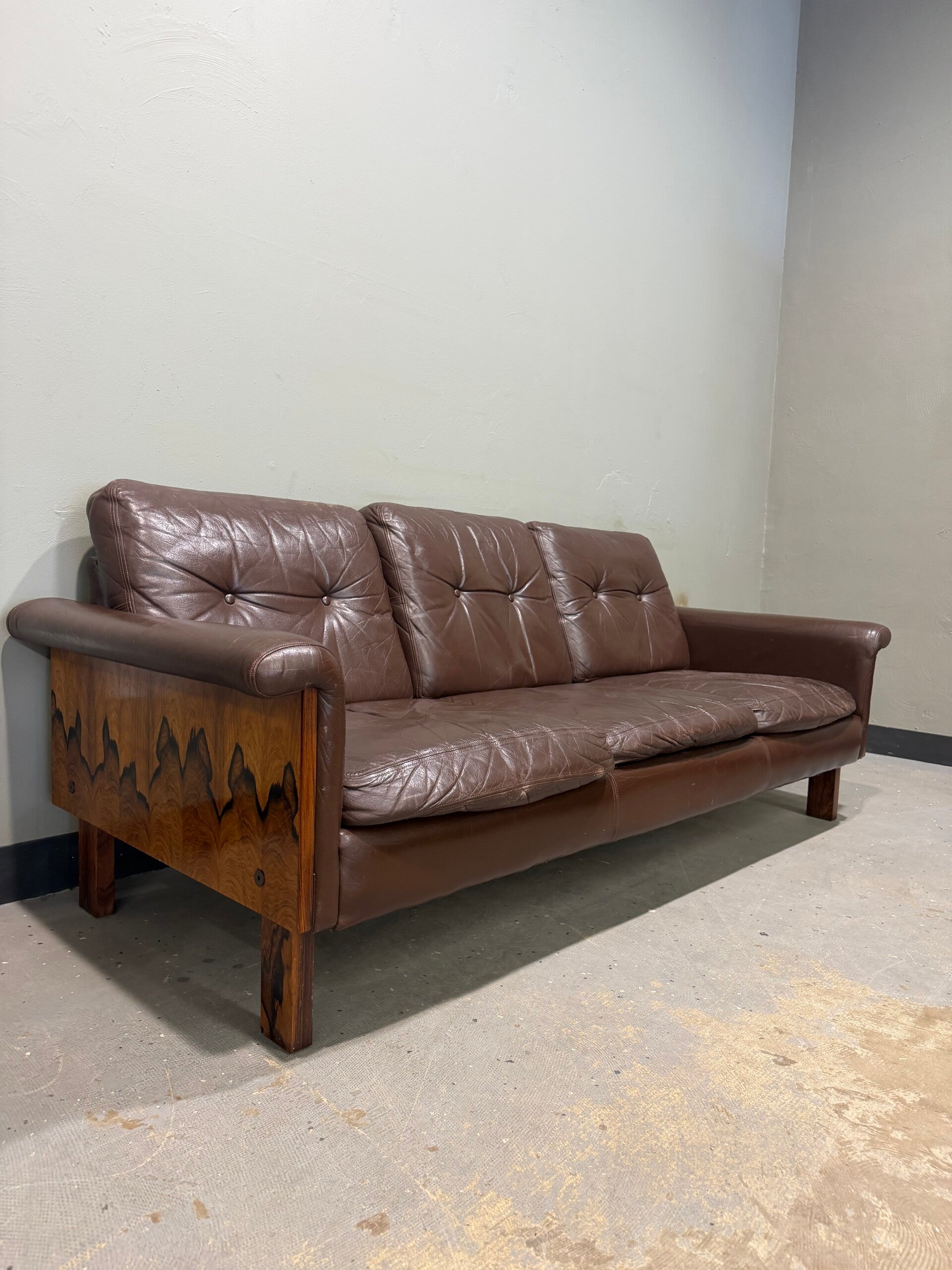 This authentic 1960s Danish Modern 3-seater sofa is a masterpiece of mid-century design, featuring a stunning solid rosewood frame with a rich, expressive grain. Its low-profile, architectural silhouette is complemented by original dark brown upholstery with classic button tufting and a distinguished vintage patina. Supported by sleek, square-profile legs, this sofa offers deep, "sink-in" comfort, making it a sophisticated and timeless focal point for any curated modern living space or executive office.