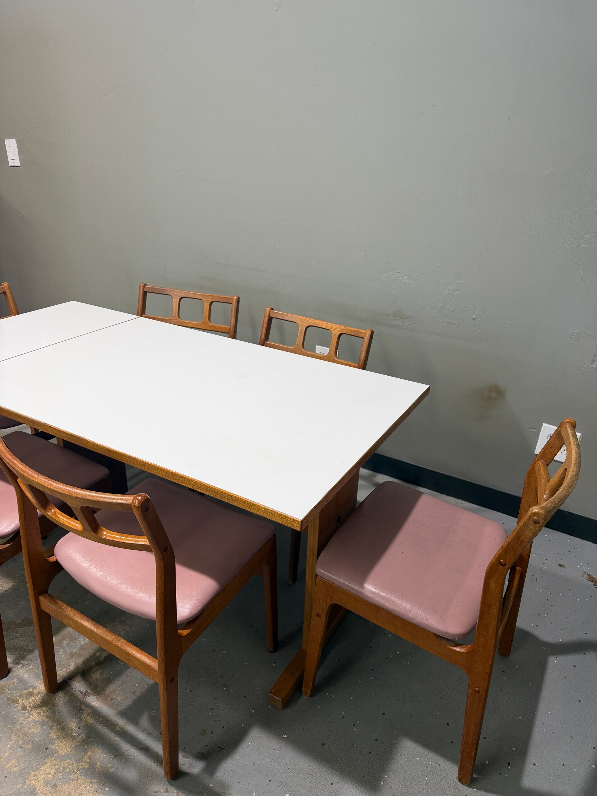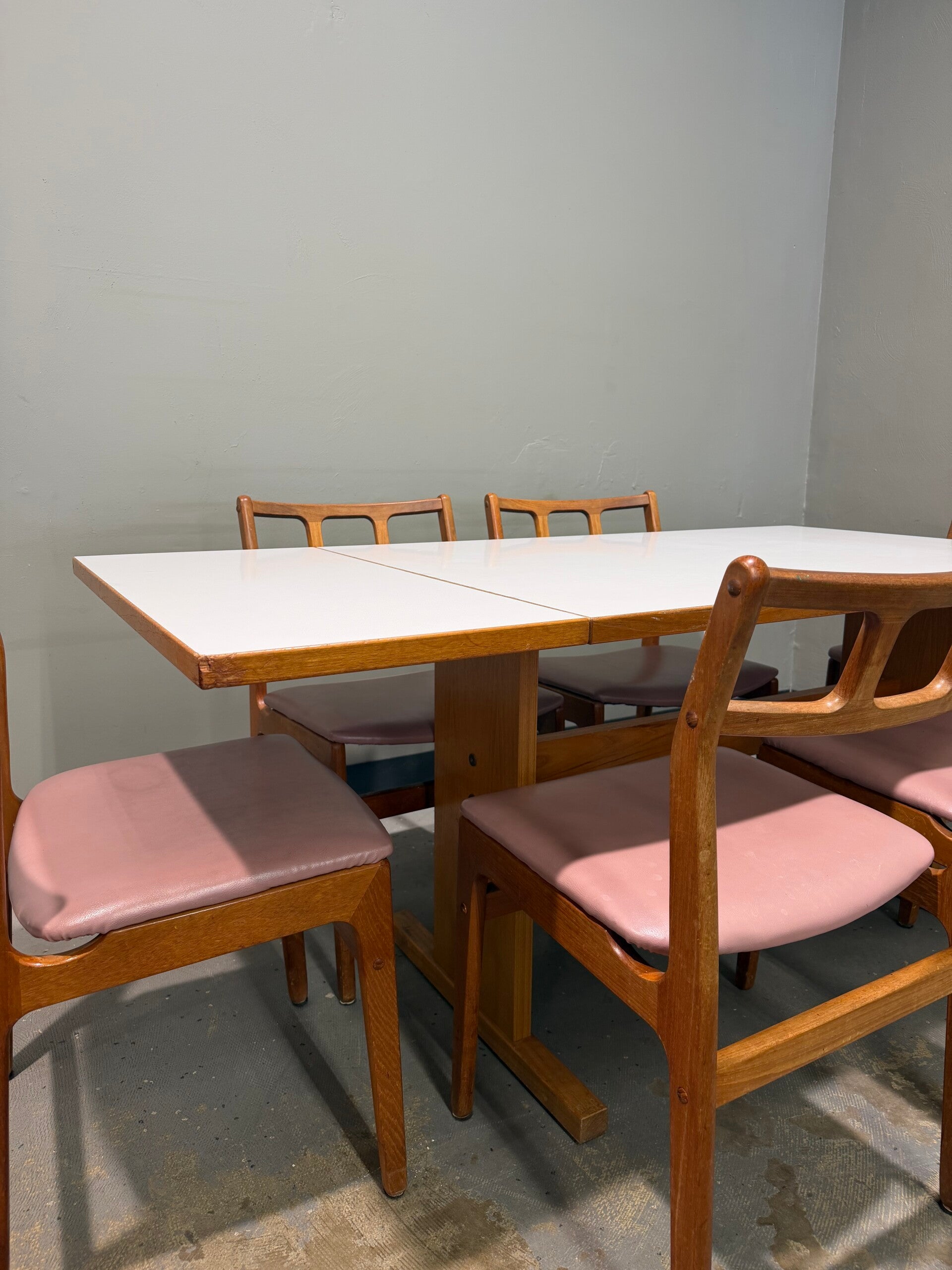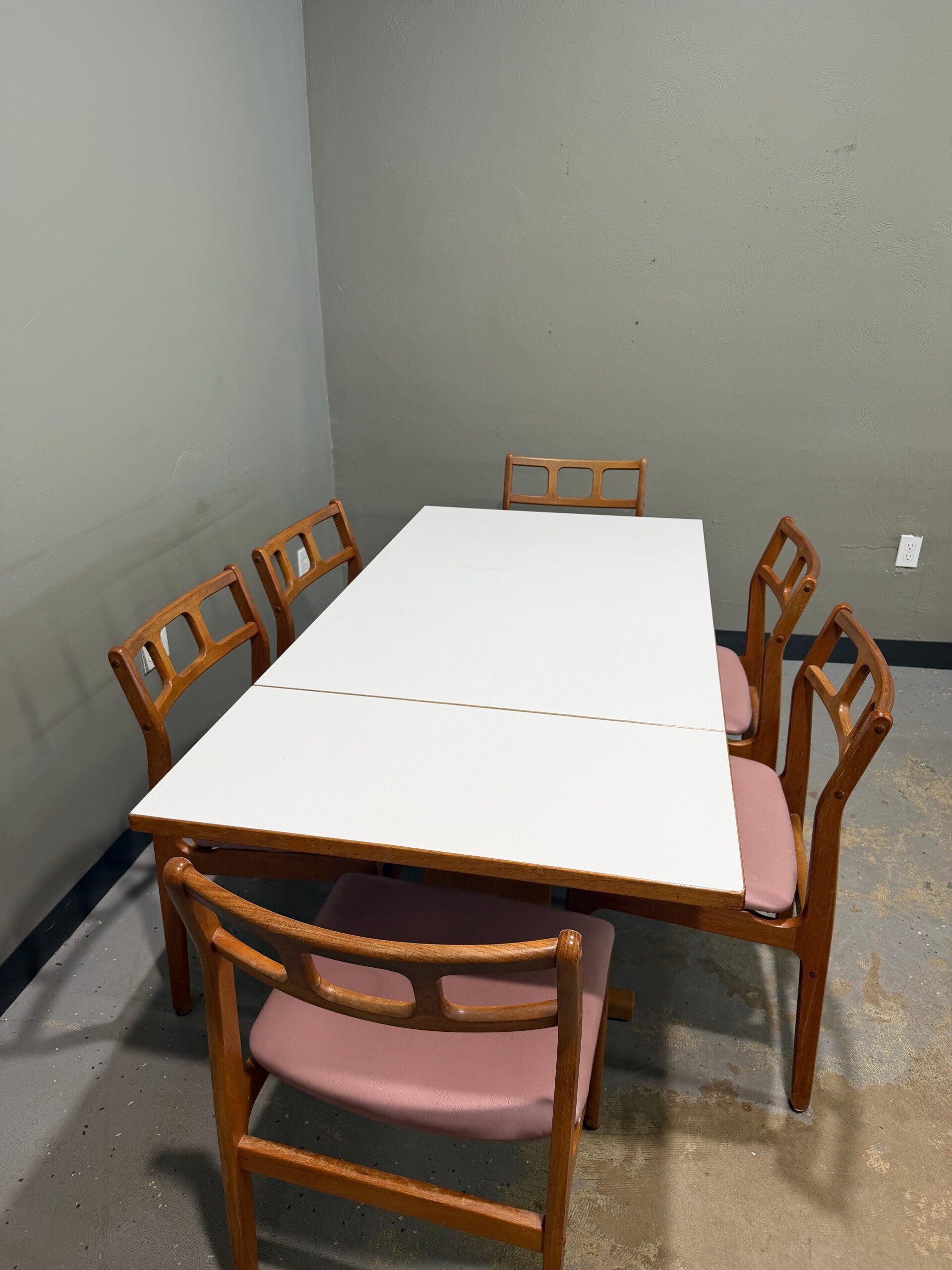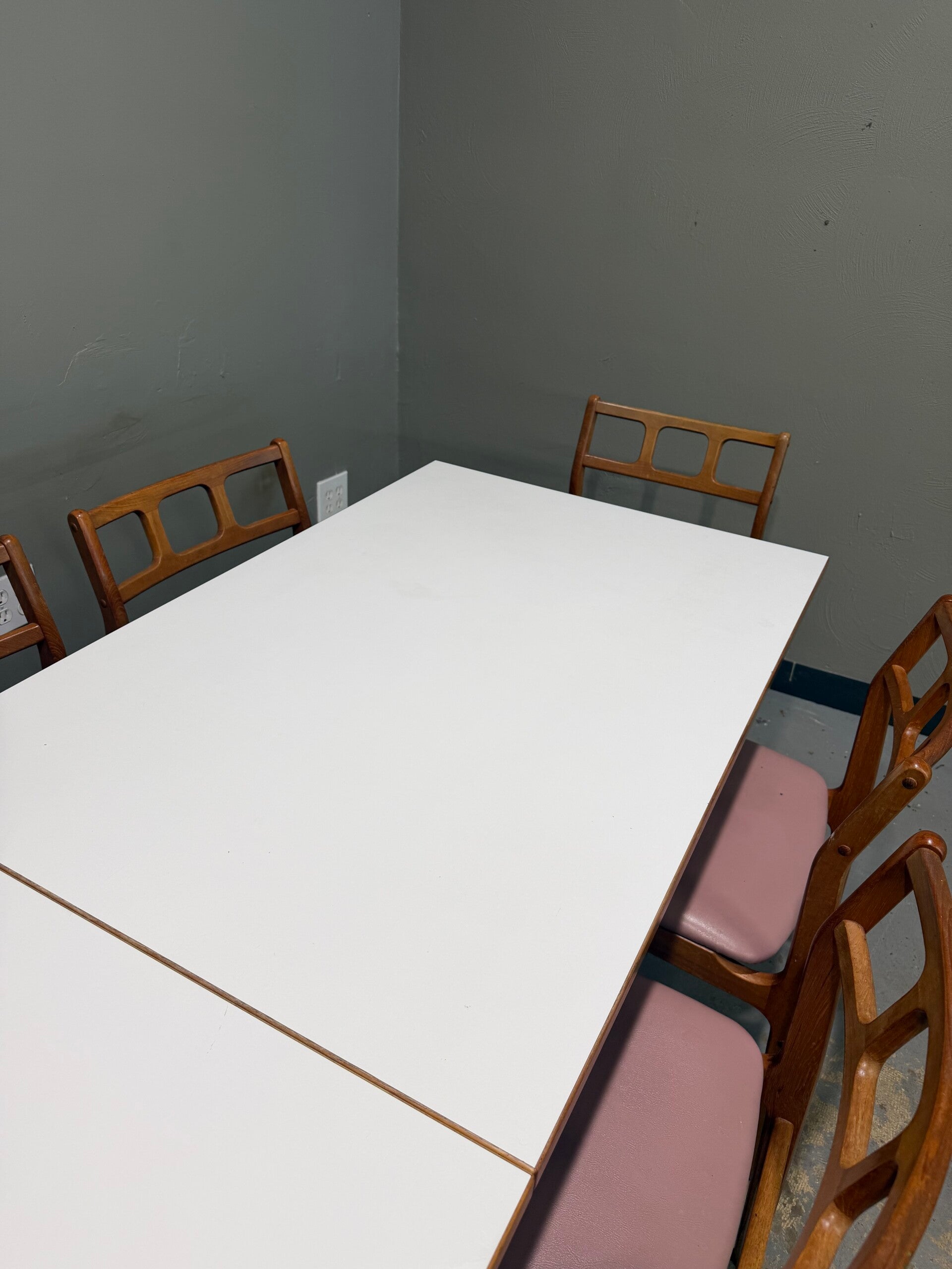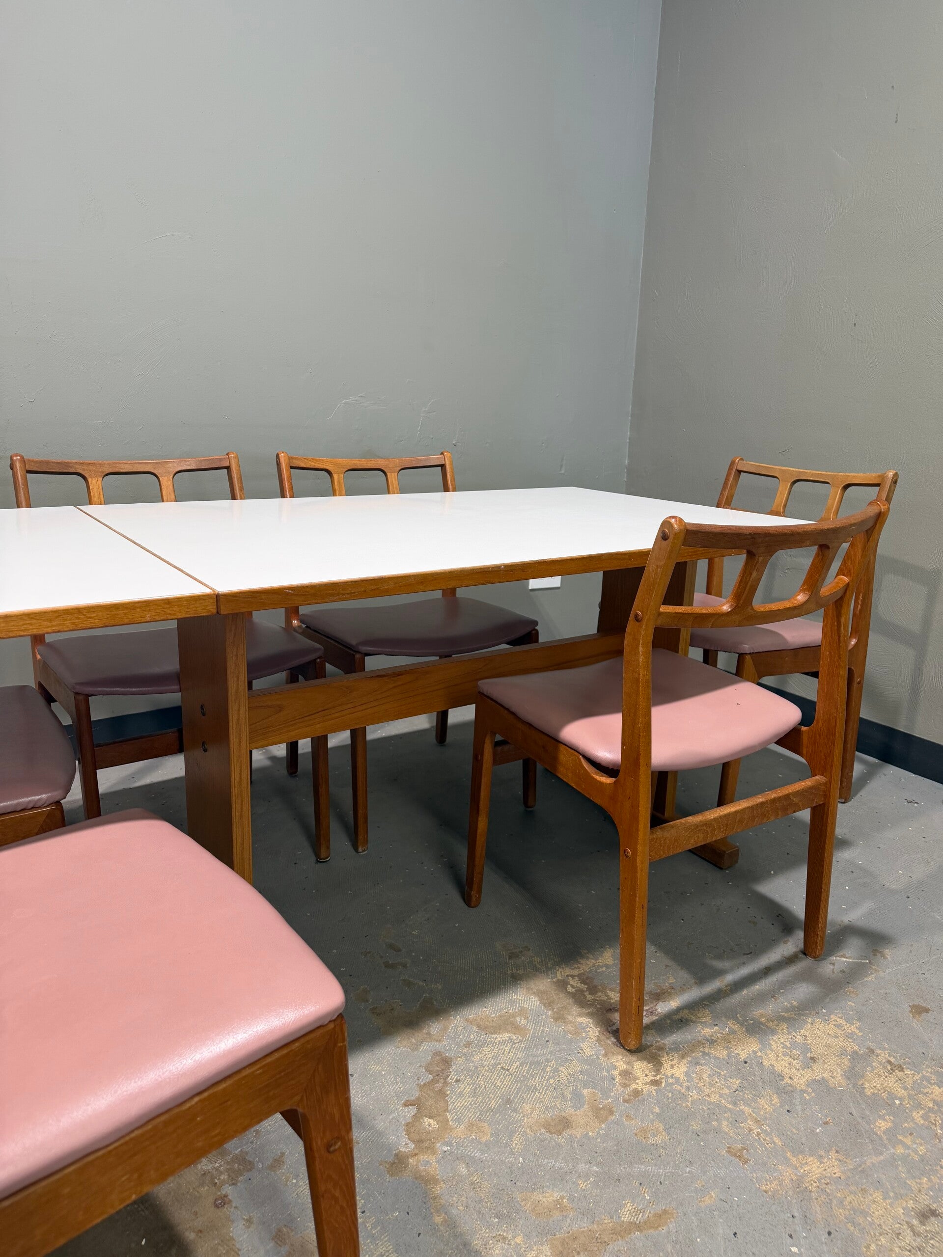 This authentic 1960s Danish Modern dining set is a masterclass in Scandinavian functionalism, featuring a rare combination of warm teak and crisp modern materials. The set centers around a rectangular dining table with a durable white laminate top—prized for its resilience—framed by a solid teak border and supported by a sturdy, architectural base. Accompanying the table are six iconic teak dining chairs, defined by their distinctive backrests with three horizontal rectangular cutouts and comfortable mauve upholstery. This versatile set offers a clean, airy geometry that perfectly bridges the gap between classic mid-century craftsmanship and modern durability, making it an ideal centerpiece for any curated contemporary dining space.