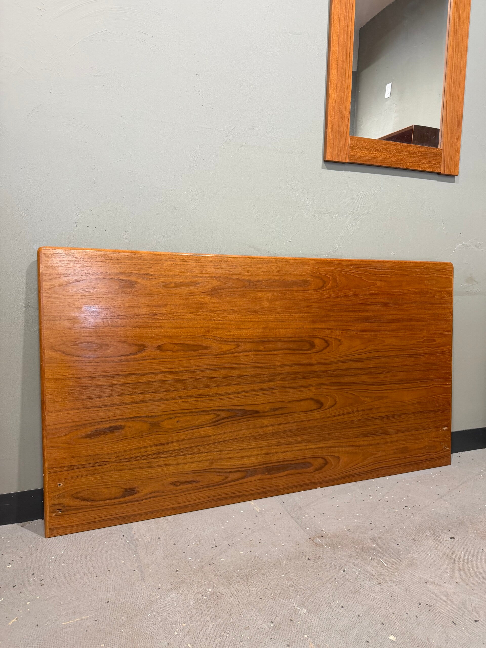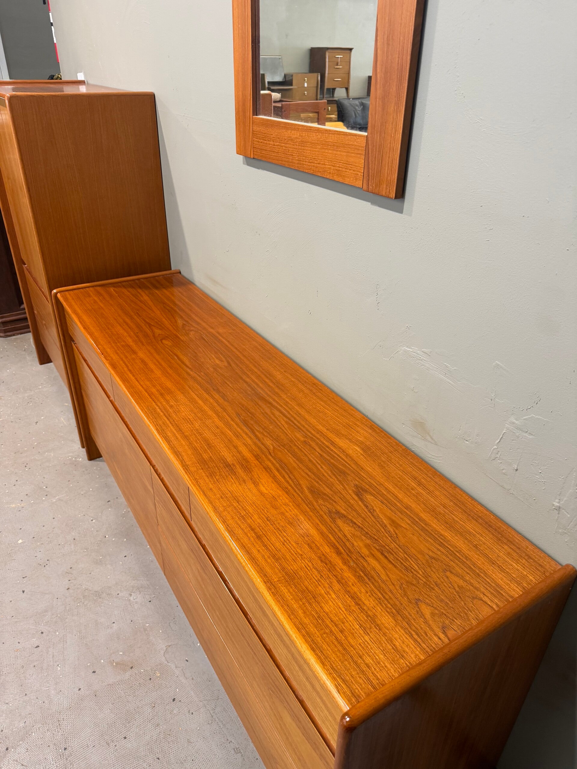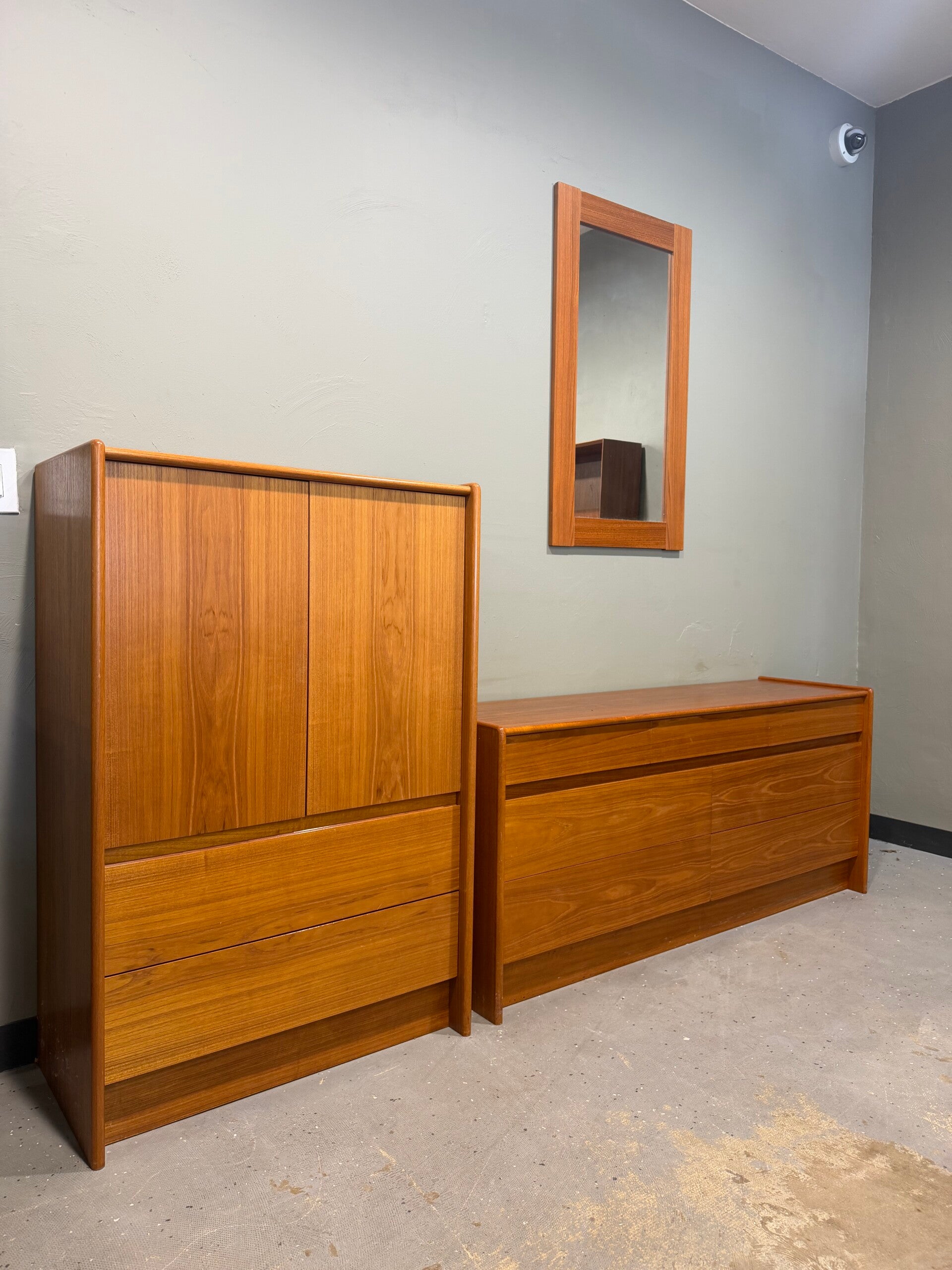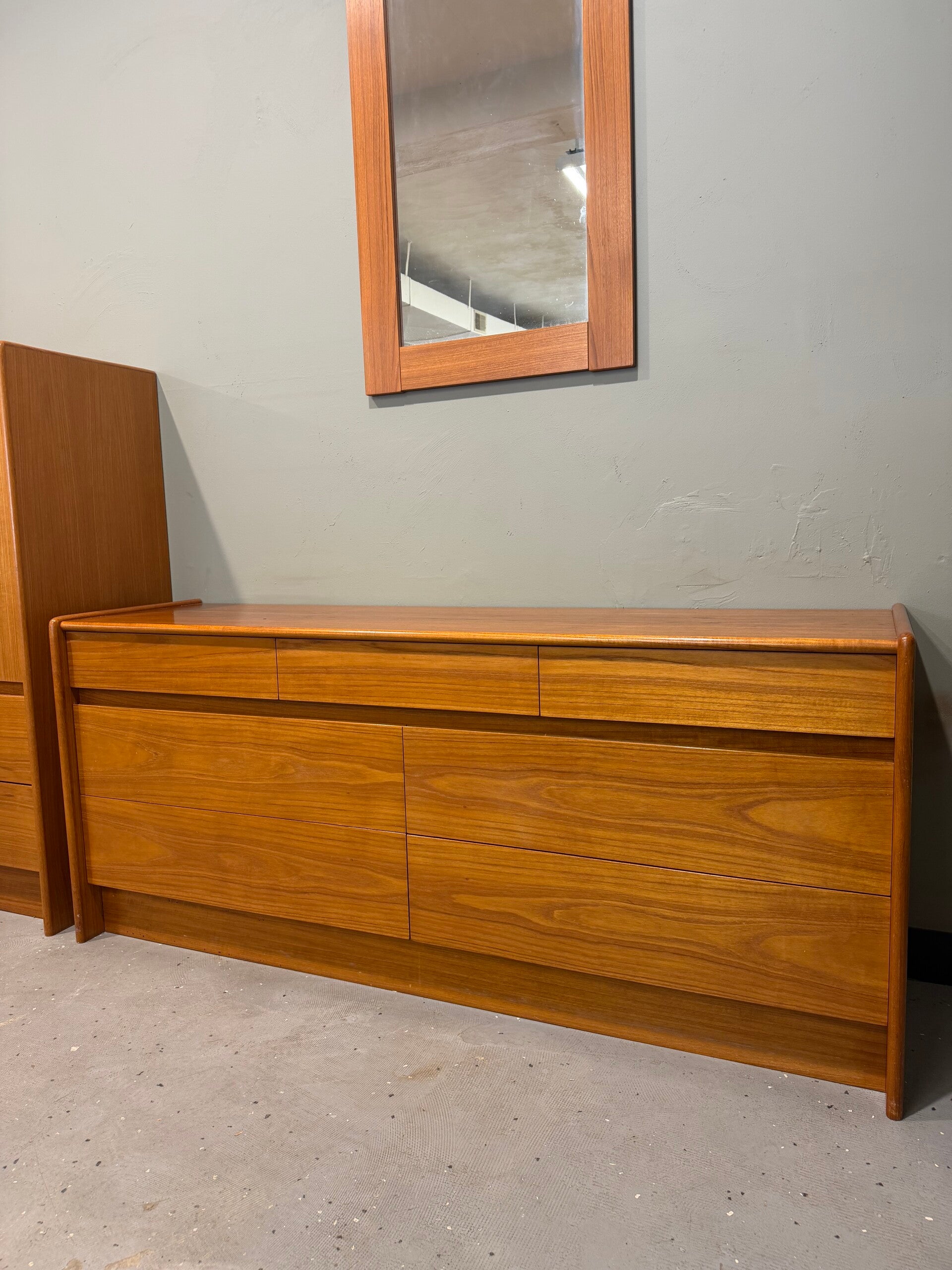 This authentic 1970s Danish Modern teak bedroom suite is a masterclass in Scandinavian functionalism, offering a complete, harmonized storage solution with an elegant, architectural silhouette. The set features a vibrant, honey-toned teak grain and minimalist integrated pulls across a versatile tall gentleman’s chest, an expansive long lowboy dresser, and a matching pair of nightstands. Completed by a sleek teak headboard and coordinating wall mirror, this vintage suite serves as a sophisticated, high-quality centerpiece that brings timeless mid-century warmth to any modern master bedroom.