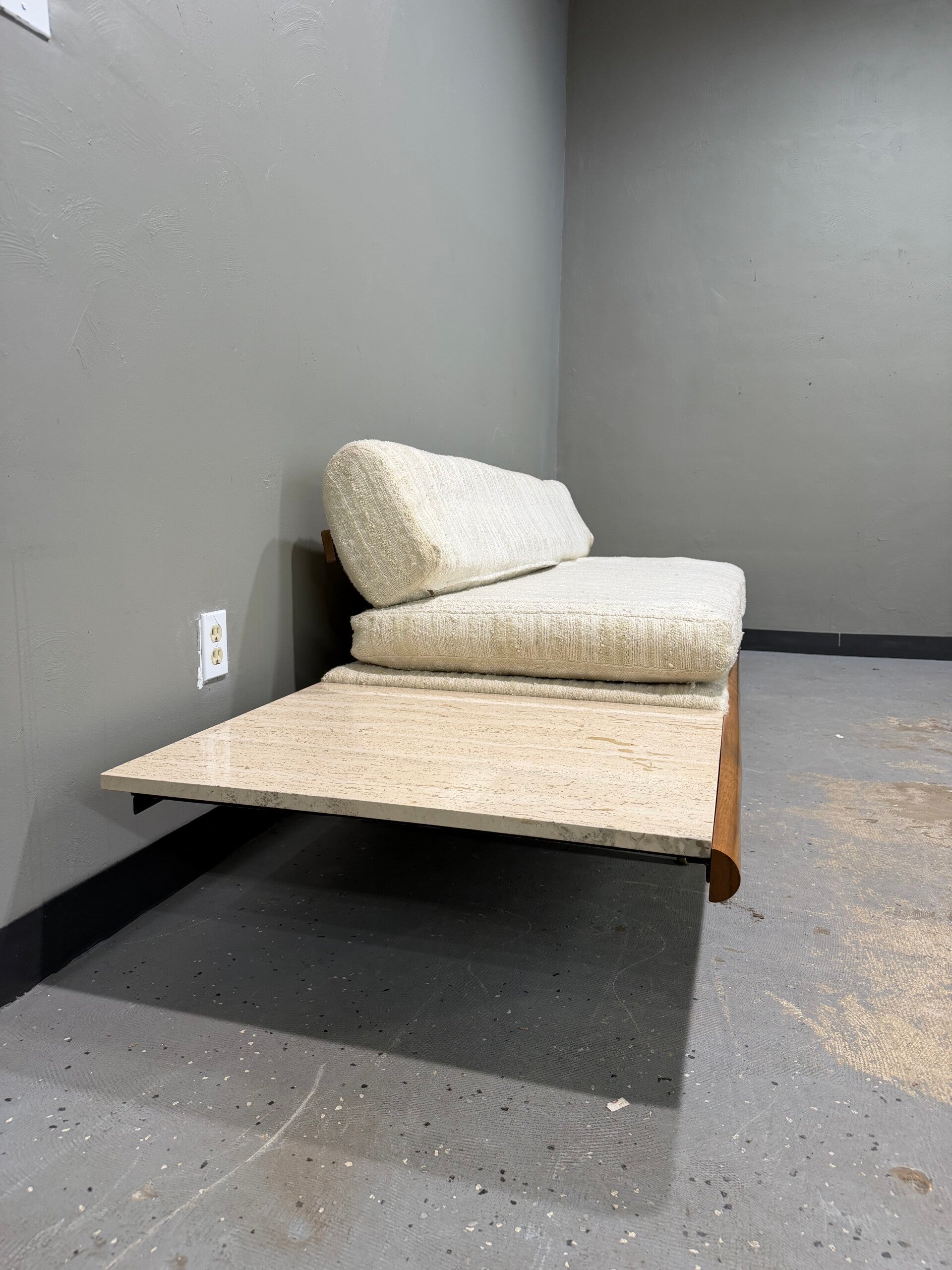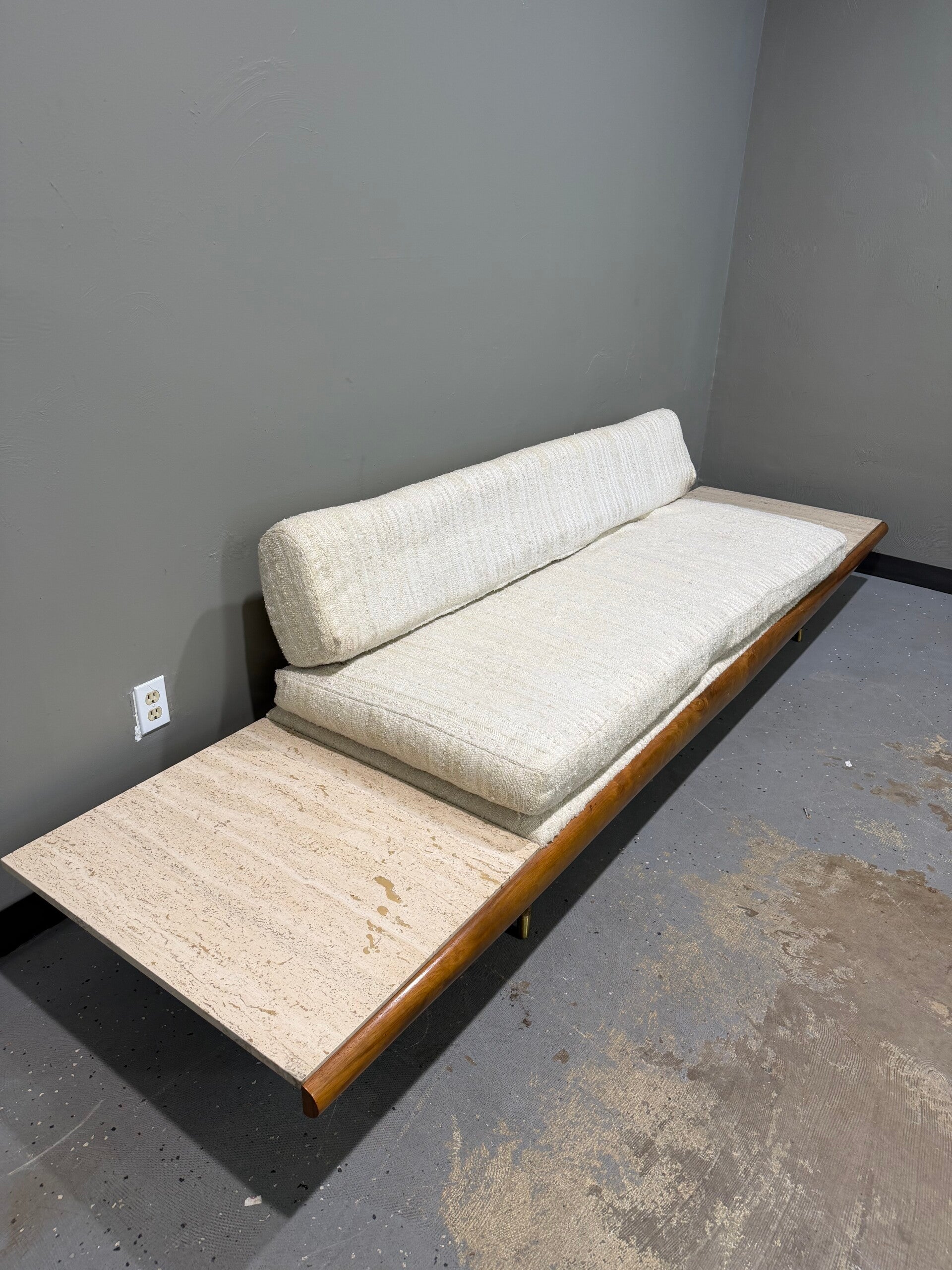 This authentic 1960s Adrian Pearsall sofa/day bed for Craft Associates is a sculptural masterpiece of Mid-Century Modern design. Defined by its dramatic, low-slung walnut frame and elegant tapered legs with brass ferrules, it features rare integrated terrazzo end tables that offer both striking visual contrast and functional surface area. This iconic piece, upholstered in a neutral oatmeal tweed, serves as a sophisticated, high-impact centerpiece for any curated modern interior.
