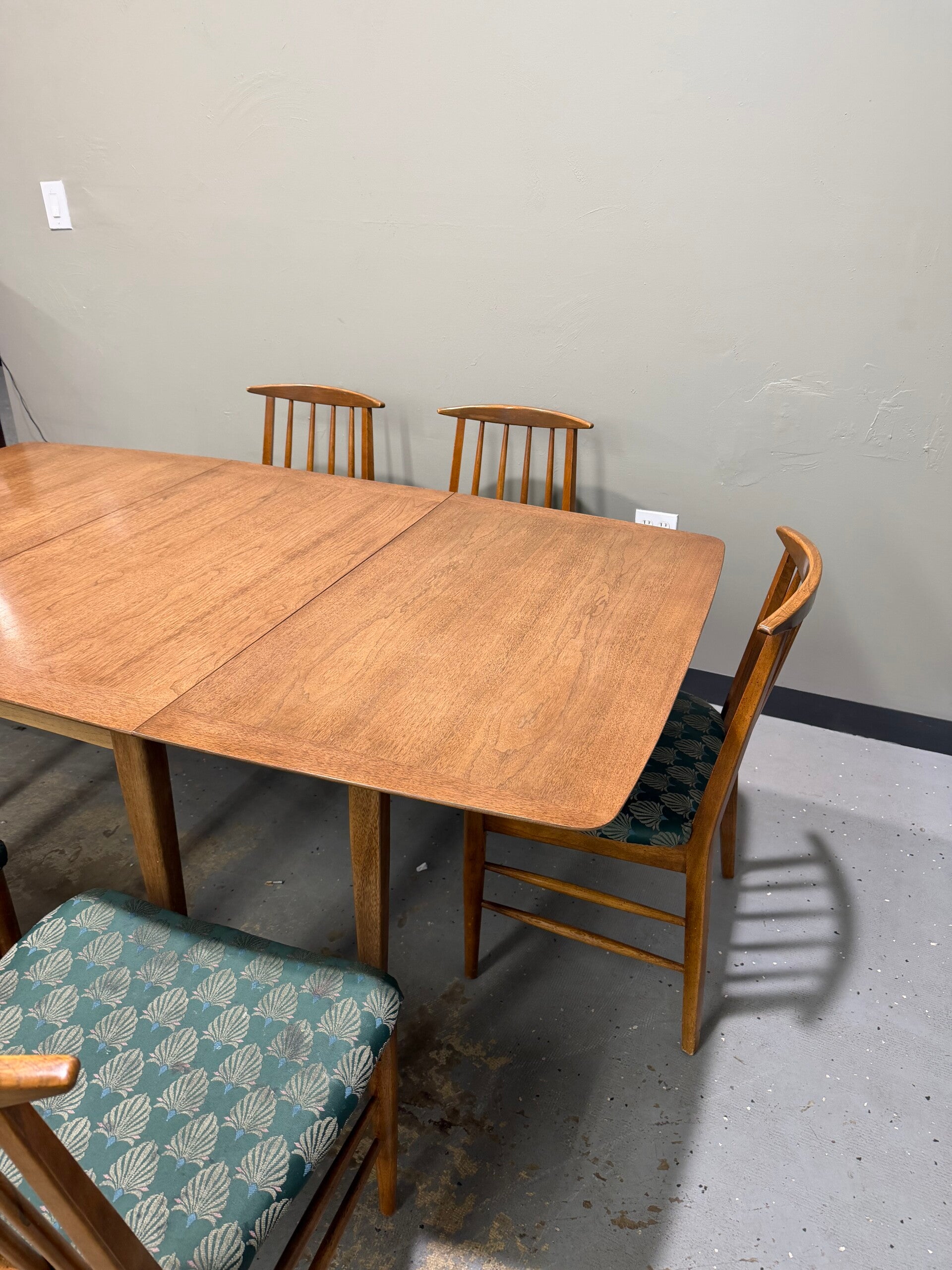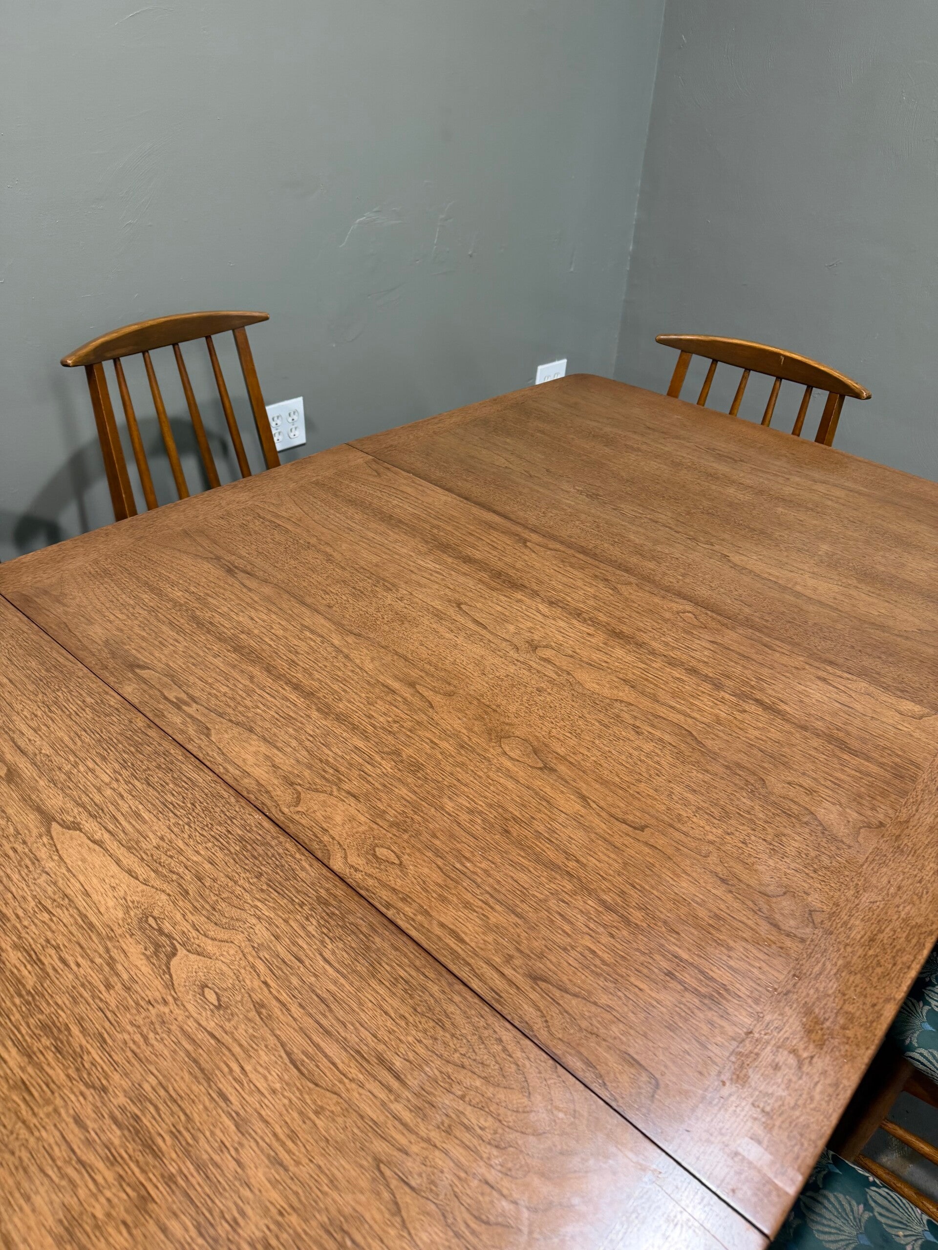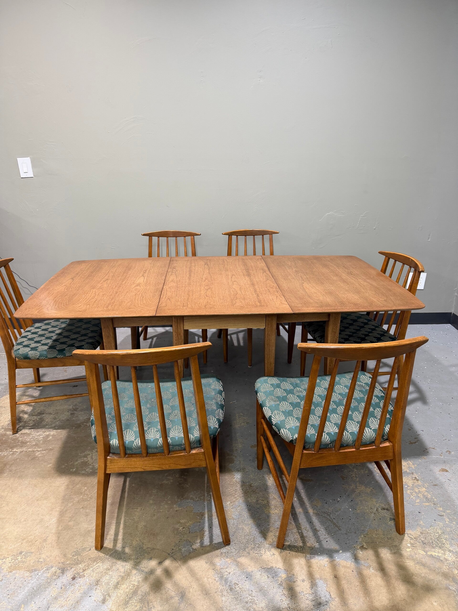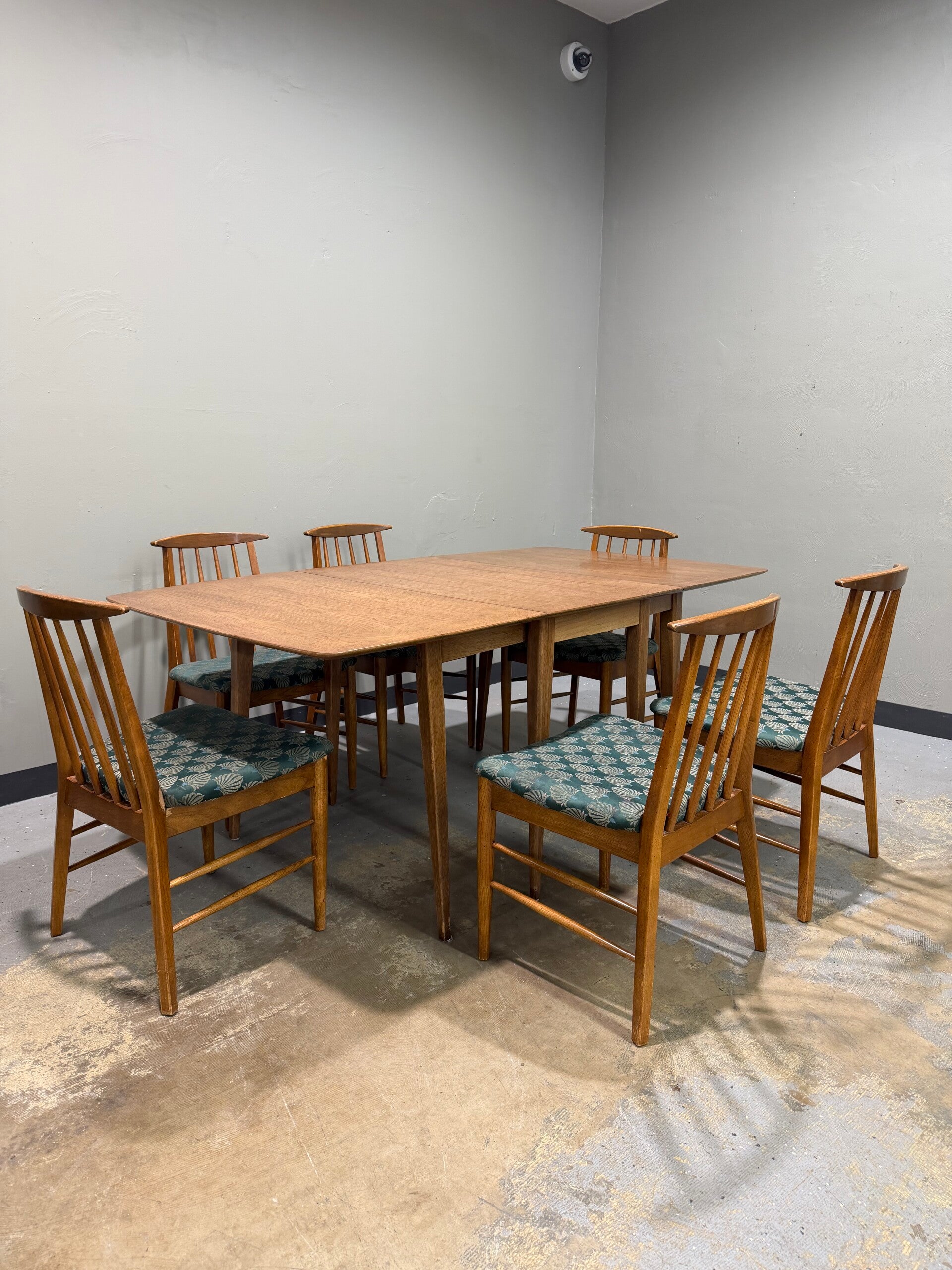 This authentic 1960s Mid-Century Modern dining set features an expansive walnut drop-leaf table paired with six elegant spindle-back chairs. Defined by its versatile double-leaf design and tapered legs, the set is accented by original teal geometric upholstery for a striking retro pop. This architectural and space-efficient collection serves as a sophisticated, high-quality centerpiece for any curated vintage or modern dining room.