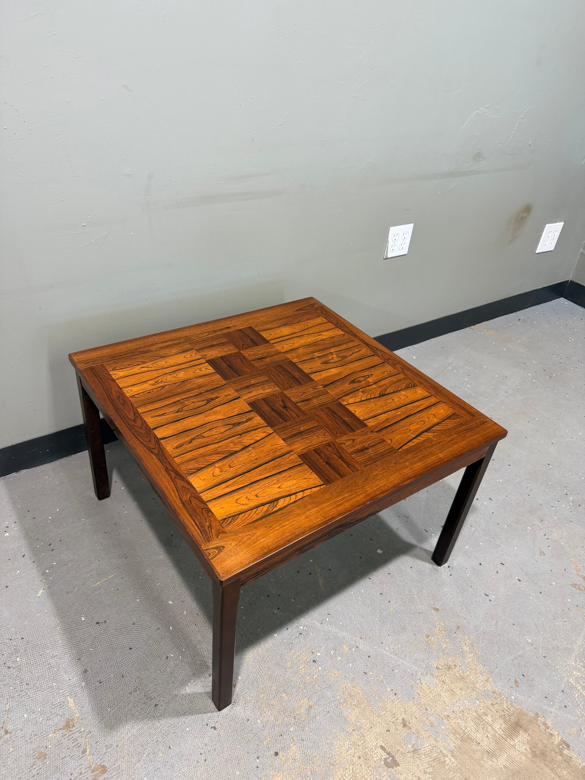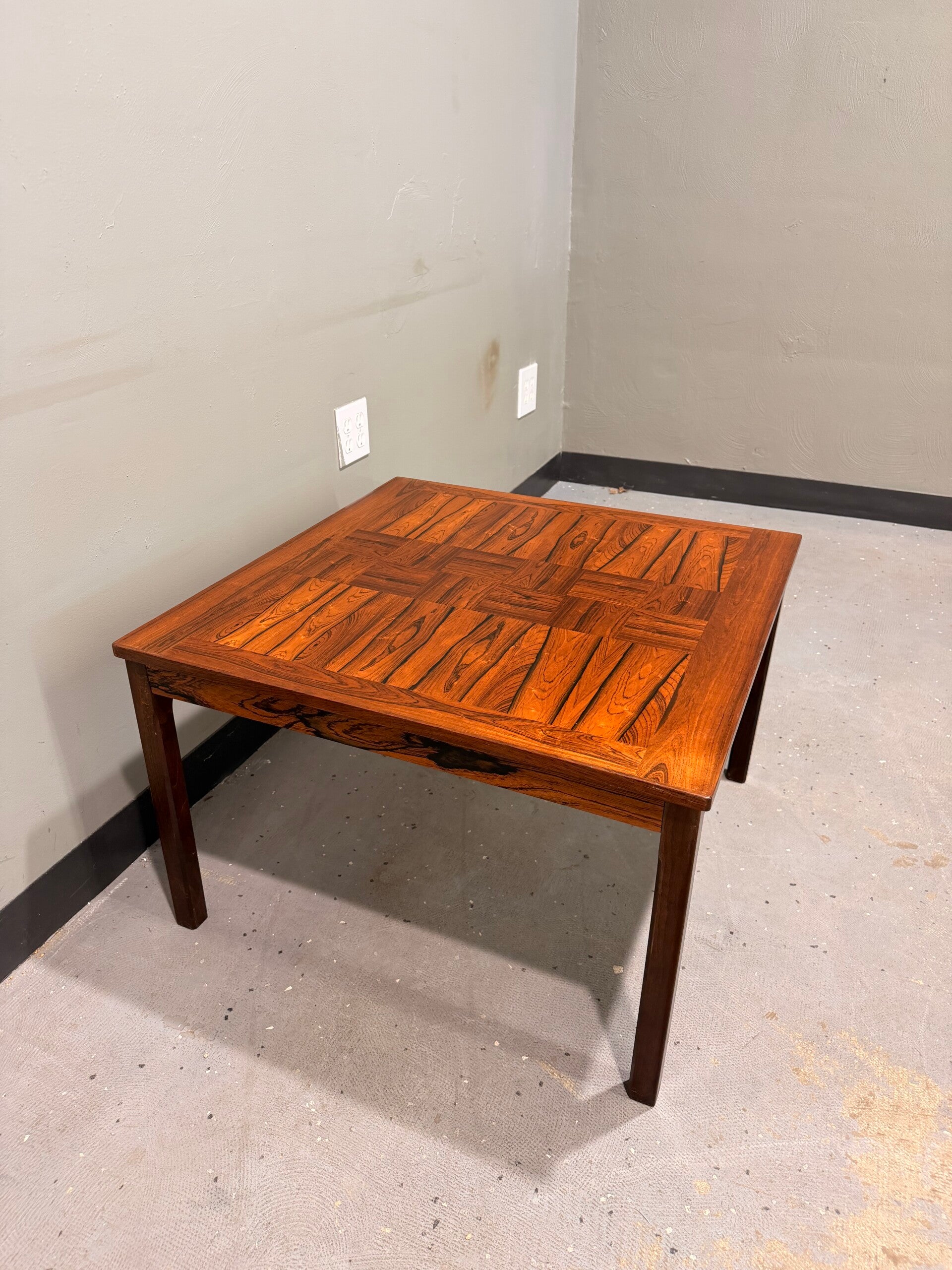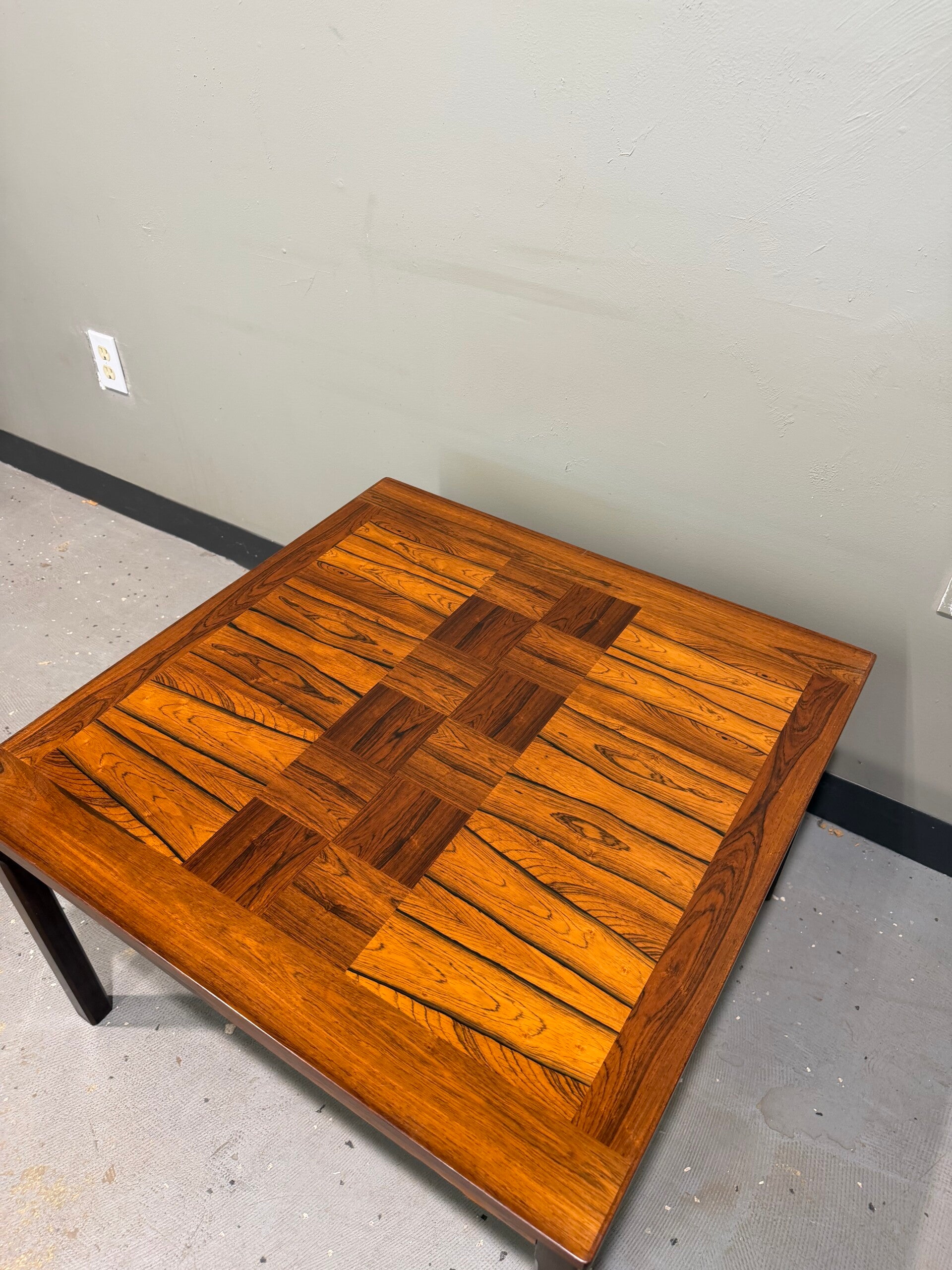 This authentic 1960s Danish Modern rosewood side table is a masterclass in Mid-Century craftsmanship, featuring a rare and intricate parquet patchwork top. Expertly crafted from Brazilian rosewood, the tabletop showcases a stunning checkerboard grain pattern that highlights the wood’s deep, rhythmic figuring and rich natural patina.