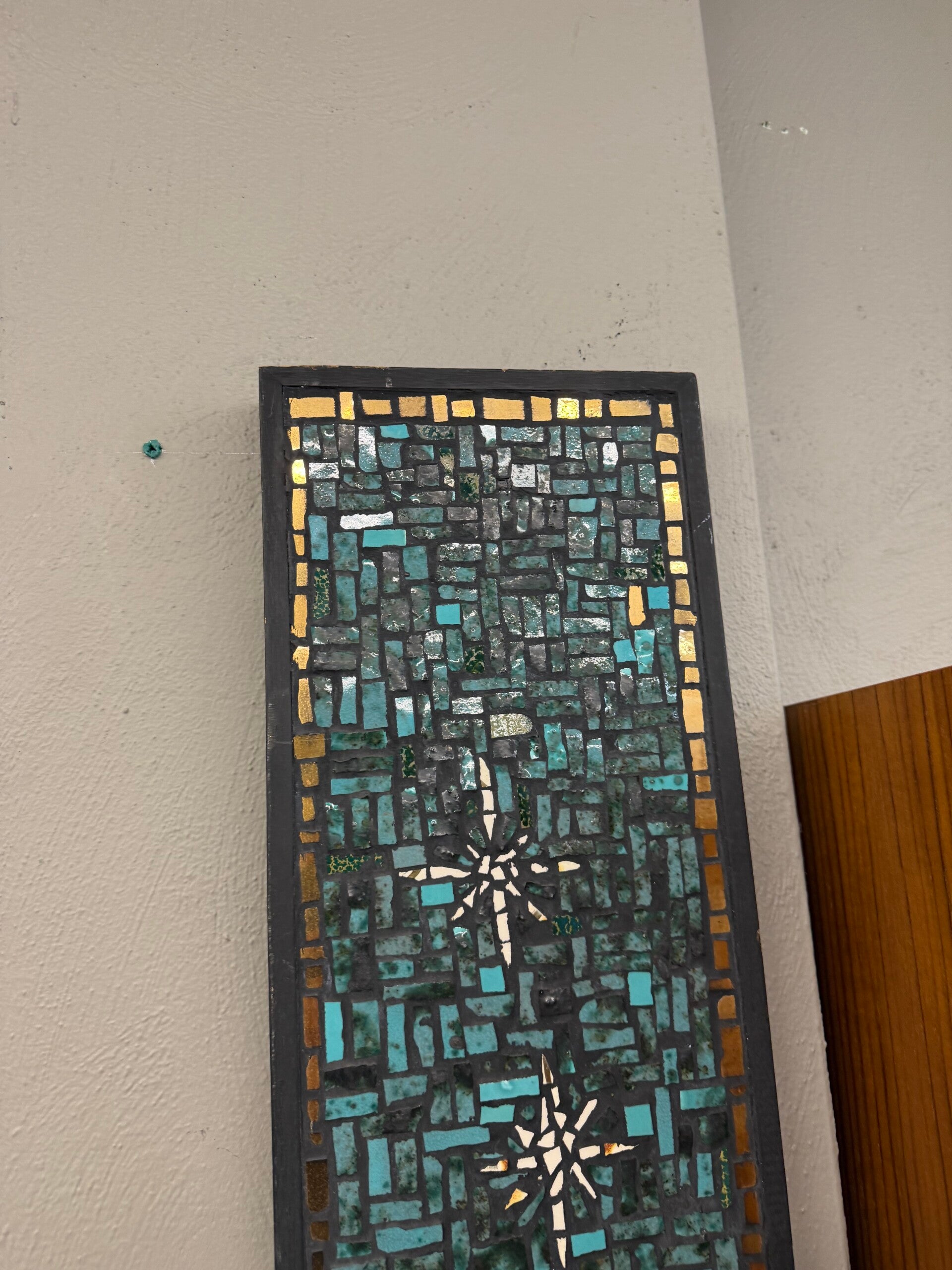 tall narrow mosaic wall art piece featuring a blue and teal tiled background with white star-like accents.