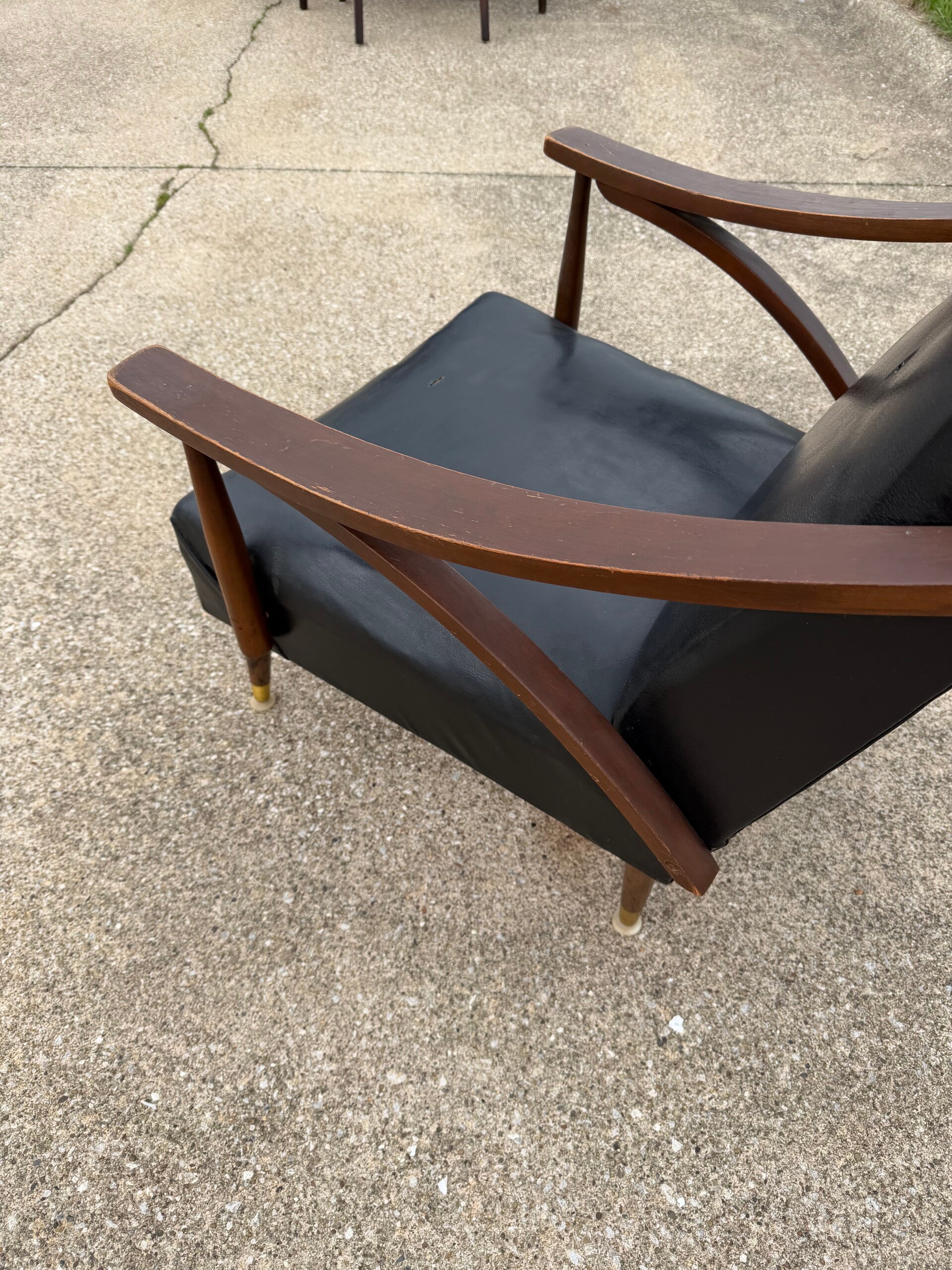 Mid-Century Modern armchair featuring wood armrests and black upholstery